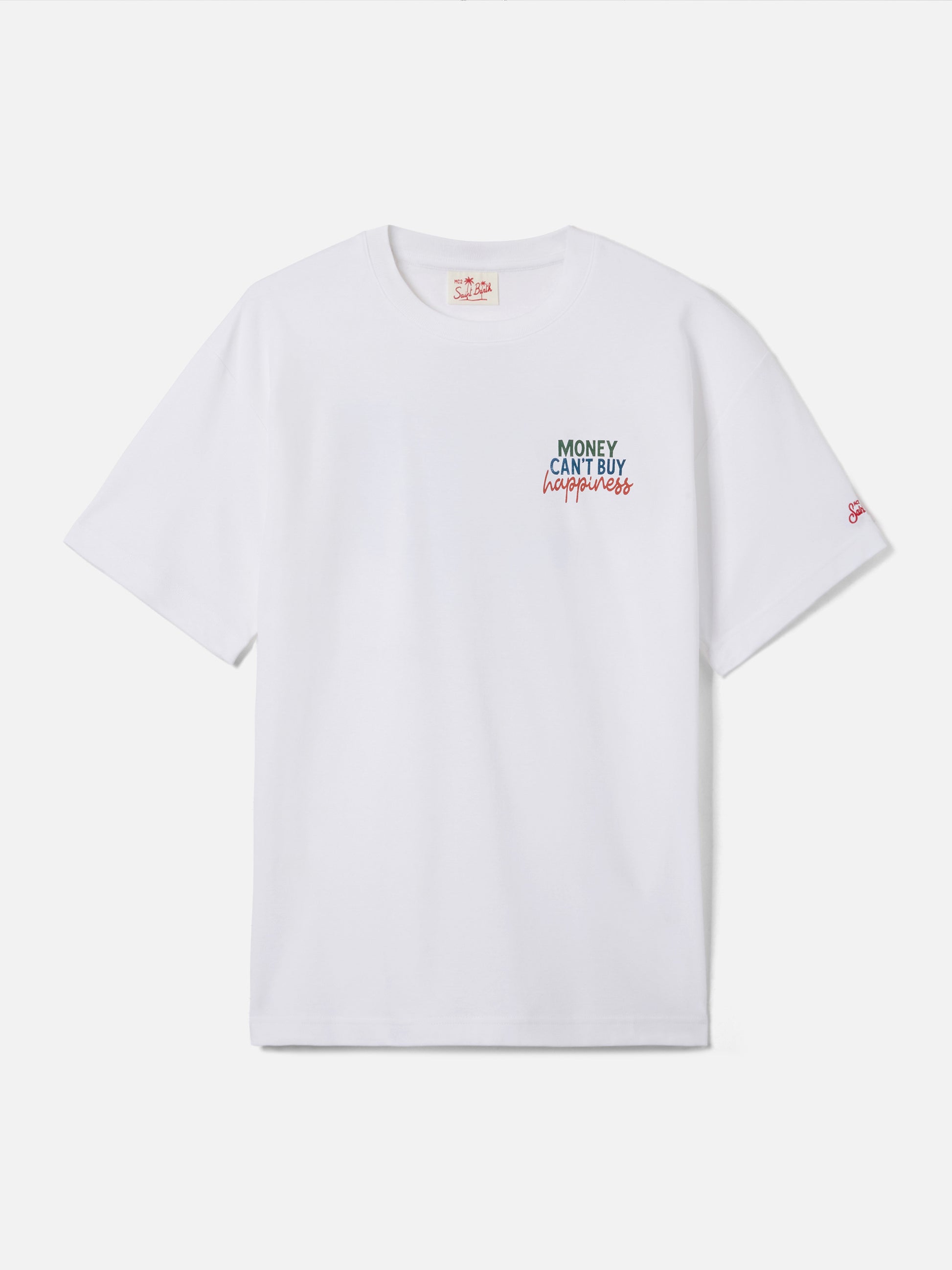 https://it.mc2saintbarth.com/en/products/delmar-t-shirt-with-money-can-t-buy-happiness-print-and-maxi-graphic-on-the-back10775856677210Delmar t-shirt with Money Can’t Buy Happiness print and maxi graphic on the back89,00https:files/UID_DLR000101525L-MAN-T-SHIRT-WHITE-MC2-MC2_5.jpghttps:files/UID_DLR000101525L-MAN-T-SHIRT-WHITE-MC2-MC2_5.jpgEURInStockT-SHIRT650948215130All Products - Only Man649134276954AVADA - Best Sellers288164774072Man T-shirts672324452698New In - Man654690484570UpSelling_Man_T-shirtsThe Delmar t-shirt is crafted from pure cotton, designed to provide comfort and a natural feel against the skin. The white solid-color design highlights the essential construction of the garment. The style features a Money Can’t Buy Happiness print on the chest, while the back is enriched with a coordinated large illustrated print depicting a summer scene with palm trees, a seaside villa and a boat, completed by the same lettering. The garment is finished with a crew neck, short sleeves and a straight silhouette with a relaxed fit.