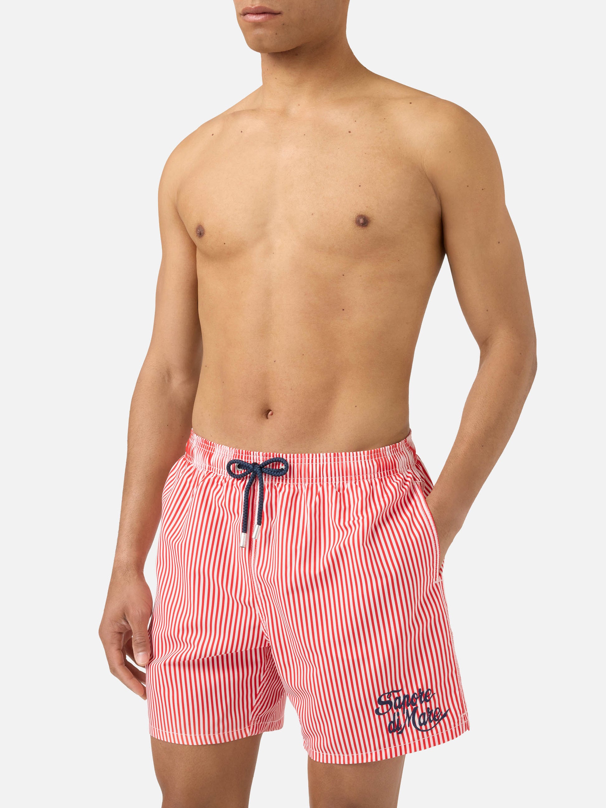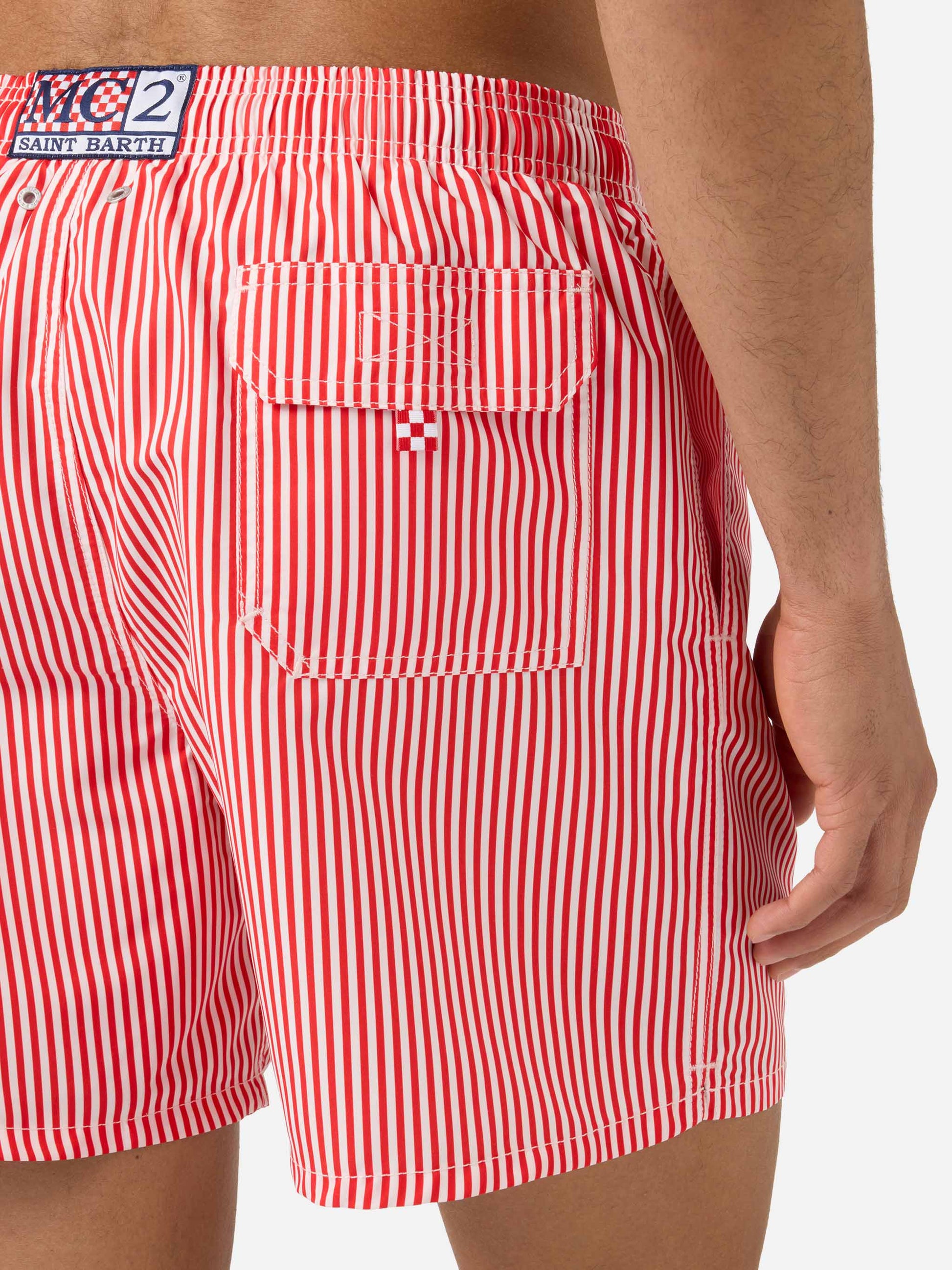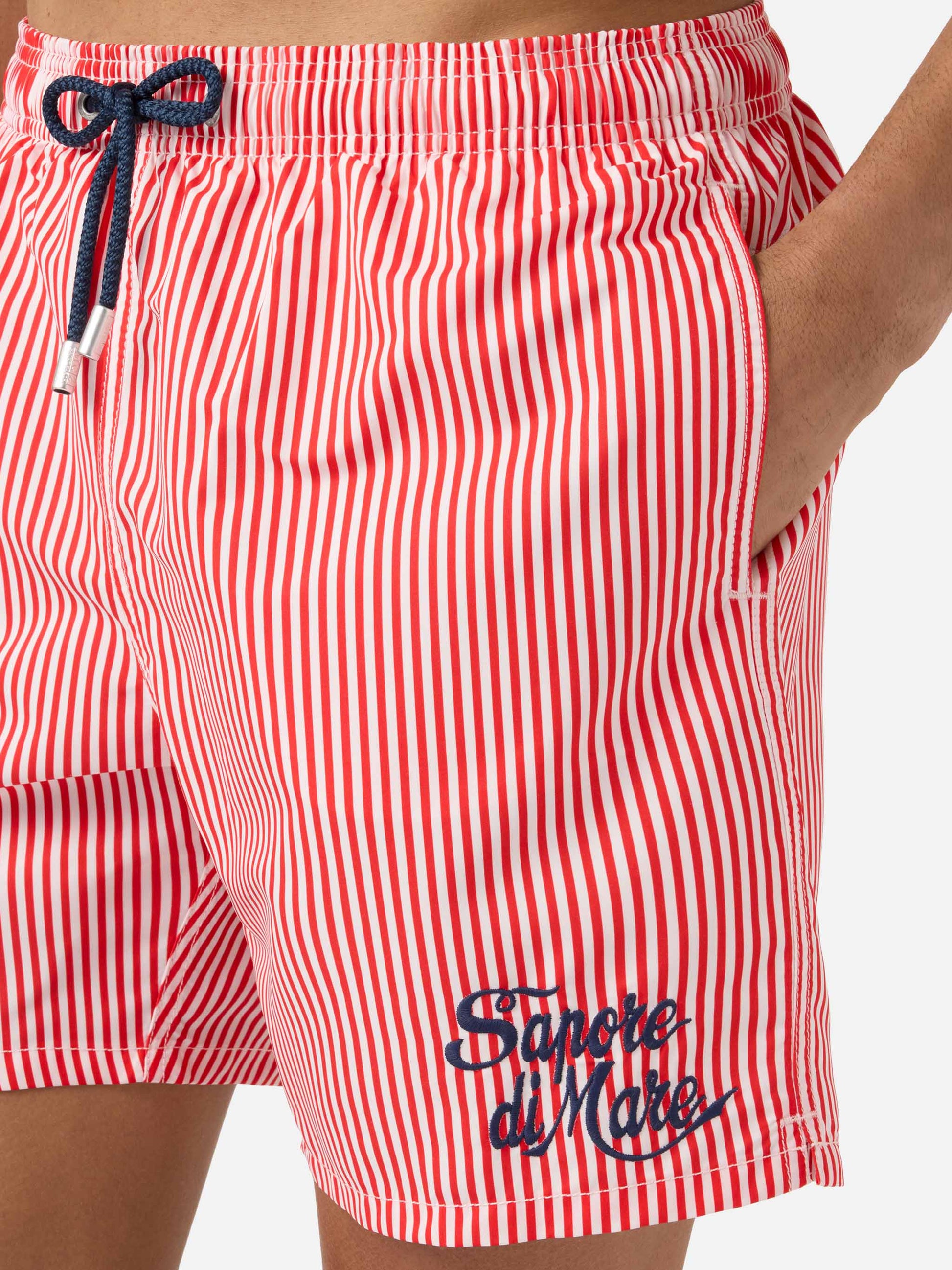 https://it.mc2saintbarth.com/en/products/gustavia-red-striped-swim-shorts-with-sapore-di-mare-embroidery-special-edition10773486436698Gustavia red striped swim shorts with Sapore di Mare embroidery | Special Edition135,00https:files/UID_GUS000108485L-MAN-SWIMSHORT-RED-MC2-SAPOREDIMARE-20260410164227_1.jpghttps:files/UID_GUS000108485L-MAN-SWIMSHORT-RED-MC2-SAPOREDIMARE-20260410164227_1.jpgEURInStockSWIMSHORT650948215130All Products - Only Man649134276954AVADA - Best Sellers673887977818Dots, Stripes & Checks Swim Shorts288251543736Man - View All Swimwear674126365018Man striped patterns674079899994Men Mini Print Swim Shorts673877852506Men Print & Graphic Swim Shorts673877754202Men Soft Hand Swim Shorts673877360986Men Swim Shorts644396843354Sapore di Mare603371077978Swimshorts All626727649626The Soft Hand Fabric654689960282UpSelling_Man_SwimshortsGustavia swim shorts in the Sapore di Mare Special Edition are crafted from lightweight fabric with a soft peach-touch finish that ensures comfort and a pleasant feel on the skin. The striped pattern in shades of red and white recalls a timeless marinière aesthetic, enriched by the contrasting Sapore di Mare embroidery that gives the style an iconic and distinctive character. The elasticated waistband with drawstring allows the fit to be easily adjusted, while the construction with side pockets, back pocket and stretch antibacterial inner mesh ensures practicality and comfort during wear.