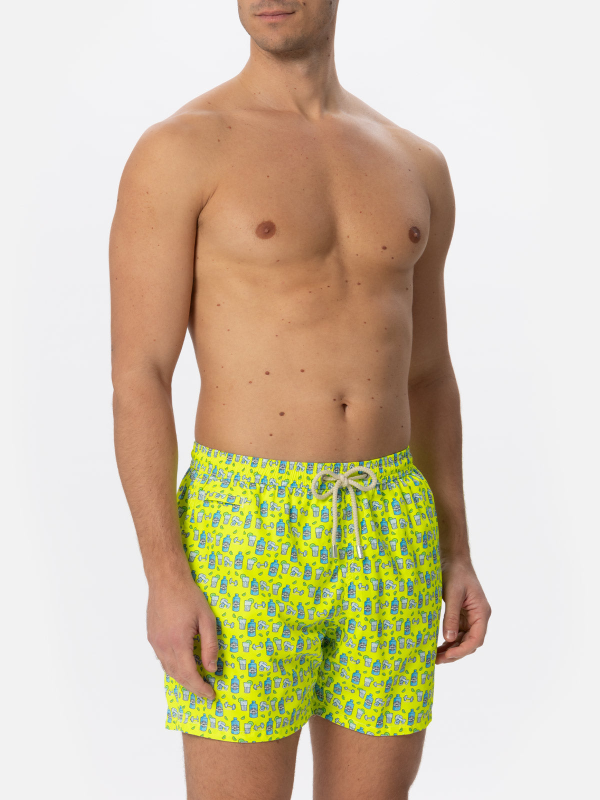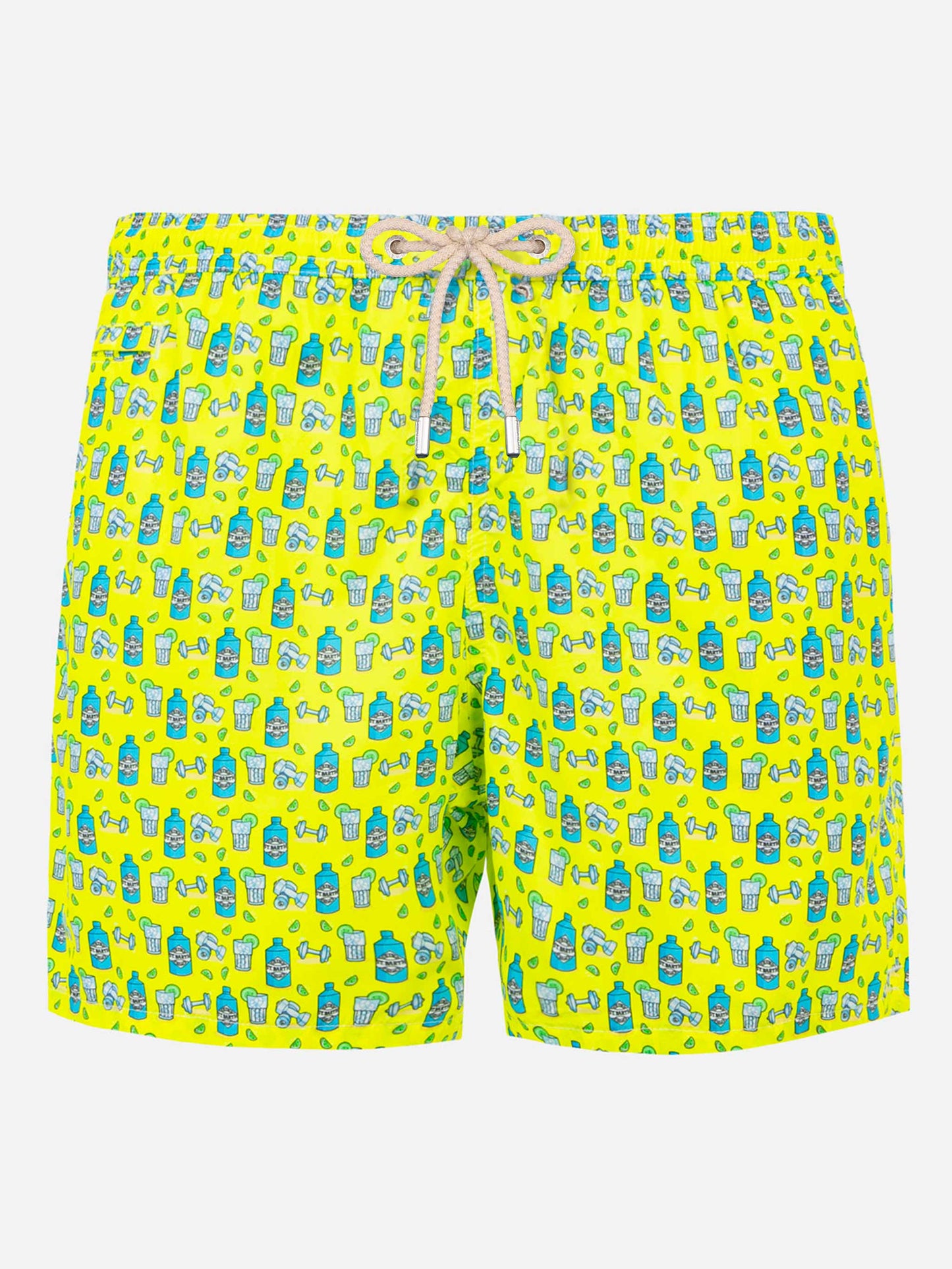 Man light fabric swim shorts with gin and gym print