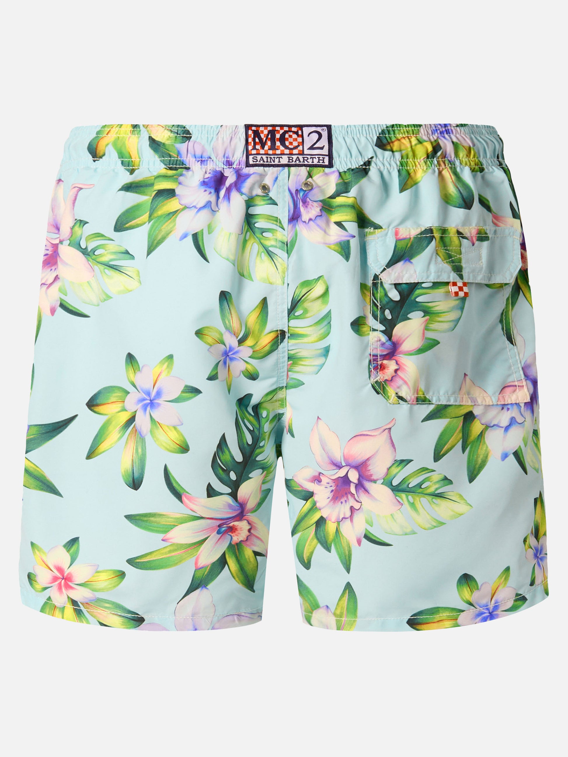 Gustavia is a timeless MC2 Saint Barth beachwear staple, featuring a classic fit, elasticized waist with drawstring, inner mesh lining for comfort, and back eyelets to prevent ballooning. Made from peach-touch fabric for a luxurious feel, it comes in a wide range of colors and patterns. Since past seasons, it's crafted from recycled polyester, reflecting our commitment to sustainability. Tropical flower all-over print Water green backcloth Elasticated waistband for comfort Adjustable drawcord with branded terminals Inner net lining Side pockets with French seams Back patch pocket with velcro closure Branded eyelets designed to drain water and avoid the ballooning effect MC2 Saint Barth exclusive label on the back Classic fit Composition: 100% recycled polyester Size L has a half waistband width of 52 cm (stretched) and varies by 2 cm for each size; side length including waistband 41.5 cm Please note that all measurements provided are approximate and subject to a tolerance of 1-2 cm due to manual measurement. This tolerance range is normal and should be expected. Model is 185 cm and wears a size large Care Instructions: cold wash by running water and neutral soap. Hang to dry. Do not leave to soak and do not dry in contact with other clothing. Do not leave the garment wet in contact with other clothing.