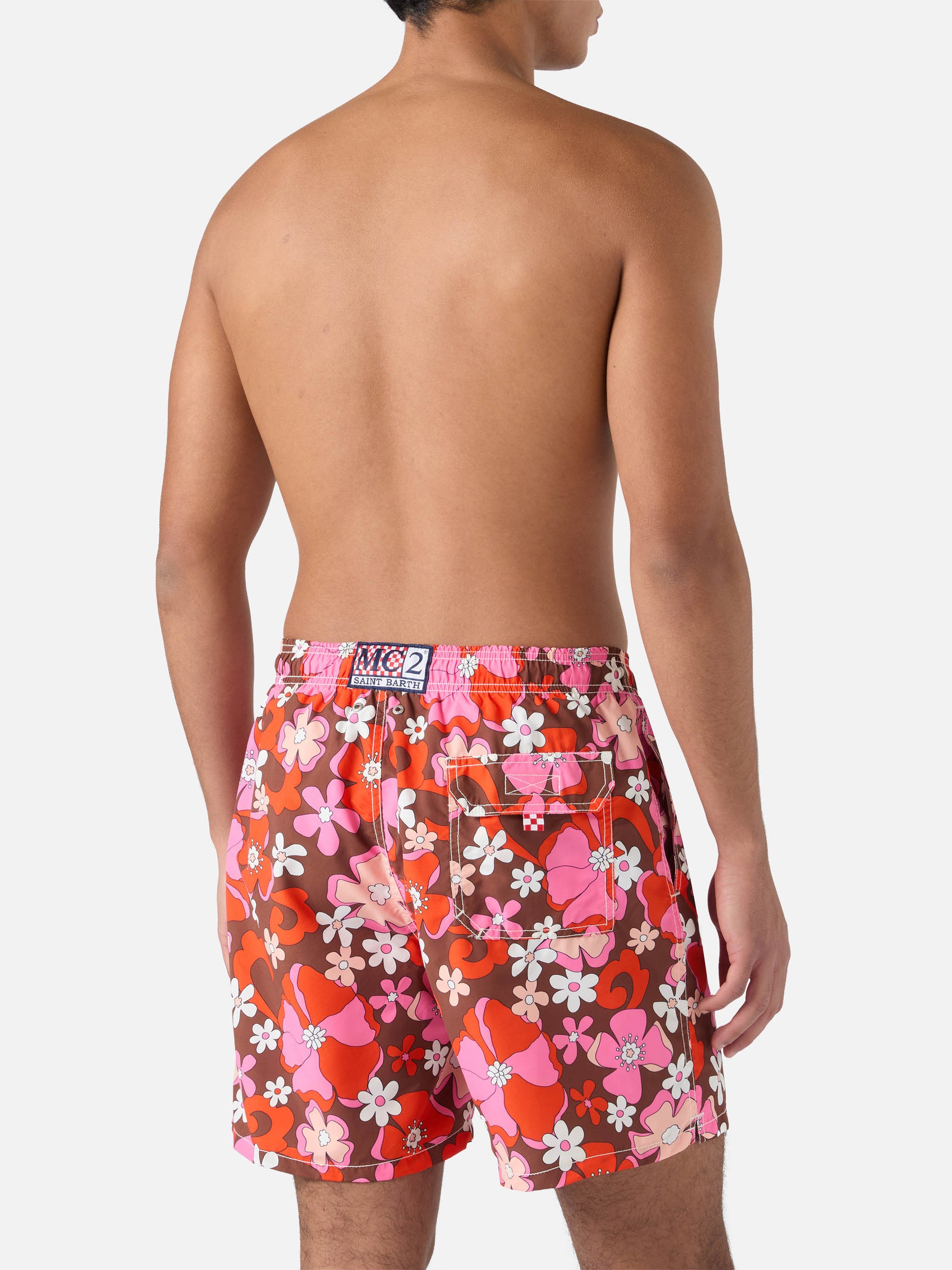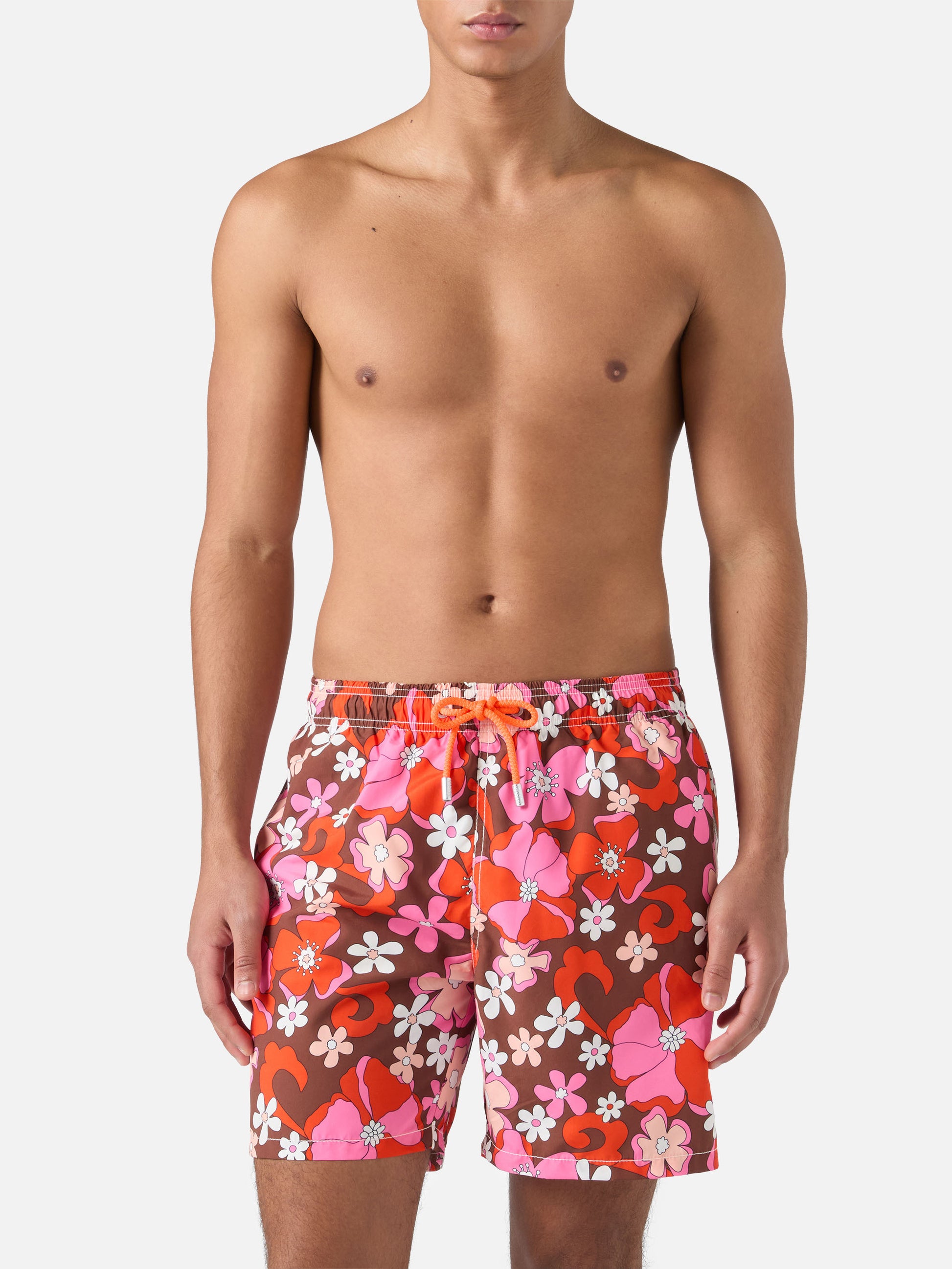 Gustavia is a timeless MC2 Saint Barth beachwear staple, featuring a classic fit, elasticized waist with drawstring, inner mesh lining for comfort, and back eyelets to prevent ballooning. Made from peach-touch fabric for a luxurious feel, it comes in a wide range of colors and patterns. Since past seasons, it's crafted from recycled polyester, reflecting our commitment to sustainability. Vintage flower all-over print Brown backcloth Elasticated waistband for comfort Adjustable drawcord with branded terminals Inner net lining Side pockets with French seams Back patch pocket with velcro closure Branded eyelets designed to drain water and avoid the ballooning effect MC2 Saint Barth exclusive label on the back Classic fit Composition: 100% recycled polyester Size L has a half waistband width of 52 cm (stretched) and varies by 2 cm for each size; side length including waistband 41.5 cm Please note that all measurements provided are approximate and subject to a tolerance of 1-2 cm due to manual measurement. This tolerance range is normal and should be expected. Model is 185 cm and wears a size large Care Instructions: cold wash by running water and neutral soap. Hang to dry. Do not leave to soak and do not dry in contact with other clothing. Do not leave the garment wet in contact with other clothing.
