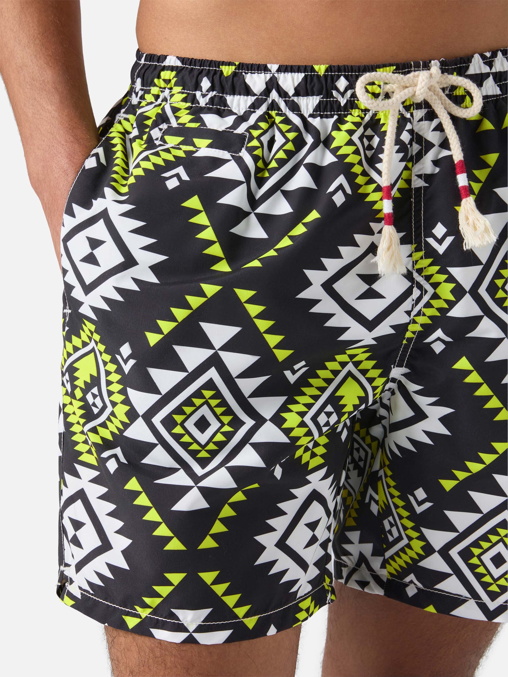 Man mid-length swim shorts Handwoven peach fabric Ethnic all-over print Black and white hues Elasticated waistband for comfort Adjustable rope-effect drawcord Inner net lining Side pockets with French seams Back pocket with button closure Front right welt micro pocket Regular fit Composition: 100% recycled polyester Size L has a half waistband width of 52 cm (stretched) and varies by 2 cm for each size; side length including waistband 42 cm and varies by 1 cm for each size Please note that all measurements provided are approximate and subject to a tolerance of 1-2 cm due to manual measurement. This tolerance range is normal and should be expected. Model is 185 cm and wears a size large