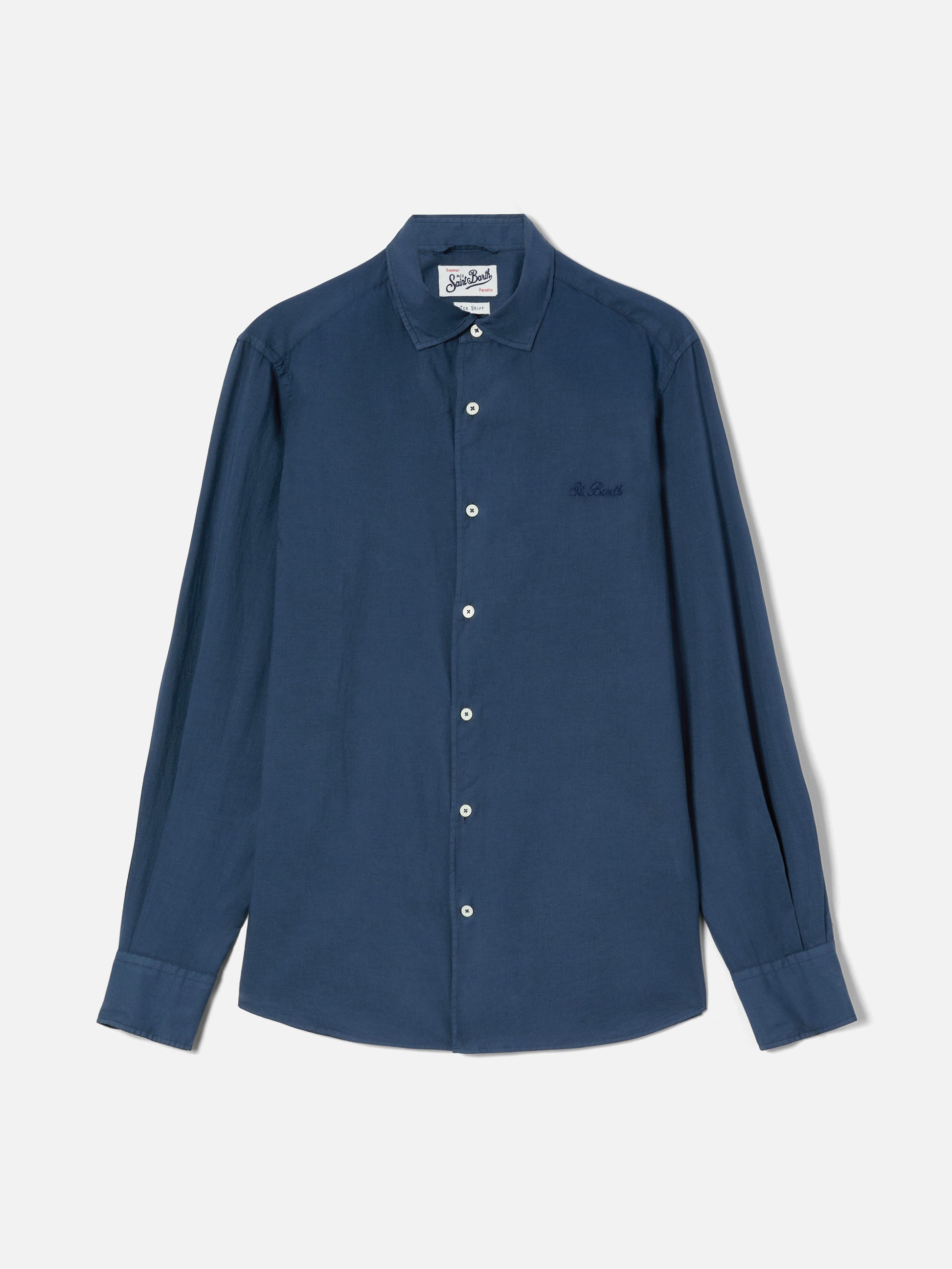 https://it.mc2saintbarth.com/en/products/navy-chemise-shirt-in-pure-cotton10780335112538Navy Chemise shirt in pure cotton139,00https:files/UID_LCM000100097L-MAN-SHIRT-BLUE-MC2-MC2_2.jpghttps:files/UID_LCM000100097L-MAN-SHIRT-BLUE-MC2-MC2_2.jpgEURInStockSHIRT650948215130All Products - Only Man649134276954AVADA - Best Sellers280529961144Man shirts672324452698New In - Man654689829210UpSelling_Man_ShirtThe Chemise shirt is crafted from pure cotton voile fabric, lightweight and breathable, designed to offer comfort and freshness. The garment features a navy blue solid color shade that enhances the essential aesthetic of the model. The design is completed by the tone-on-tone St. Barth embroidery on the chest. The model features a classic collar, front button closure with logo buttons and long sleeves. The fluid line ensures a comfortable and natural fit.