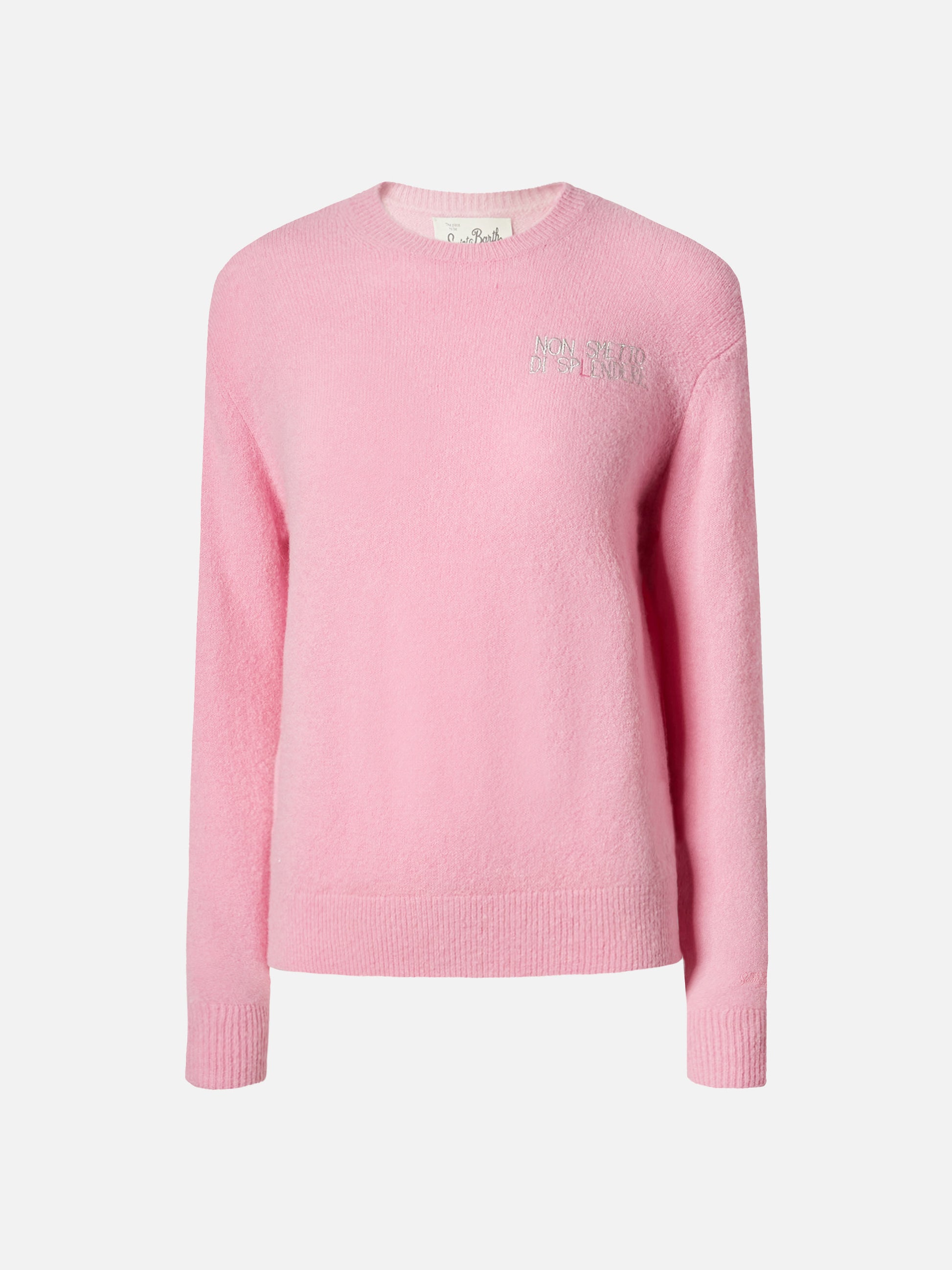 New Queen stretch sweater in merino-wool and alpaca blend in pink with Non smetto di sp(l)endere embroidery