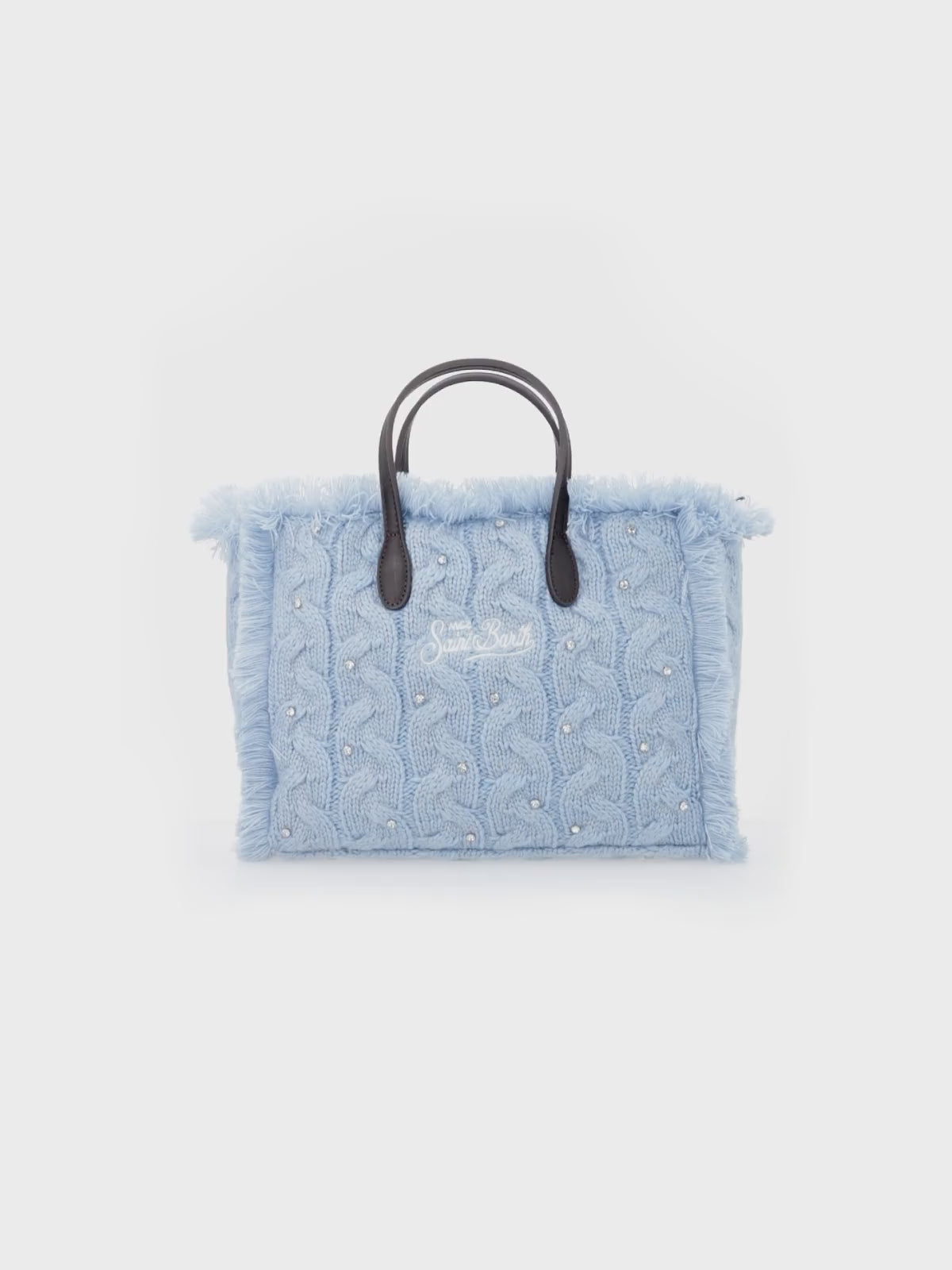 Light blue cable knit Colette handbag with rhinestones embellishment