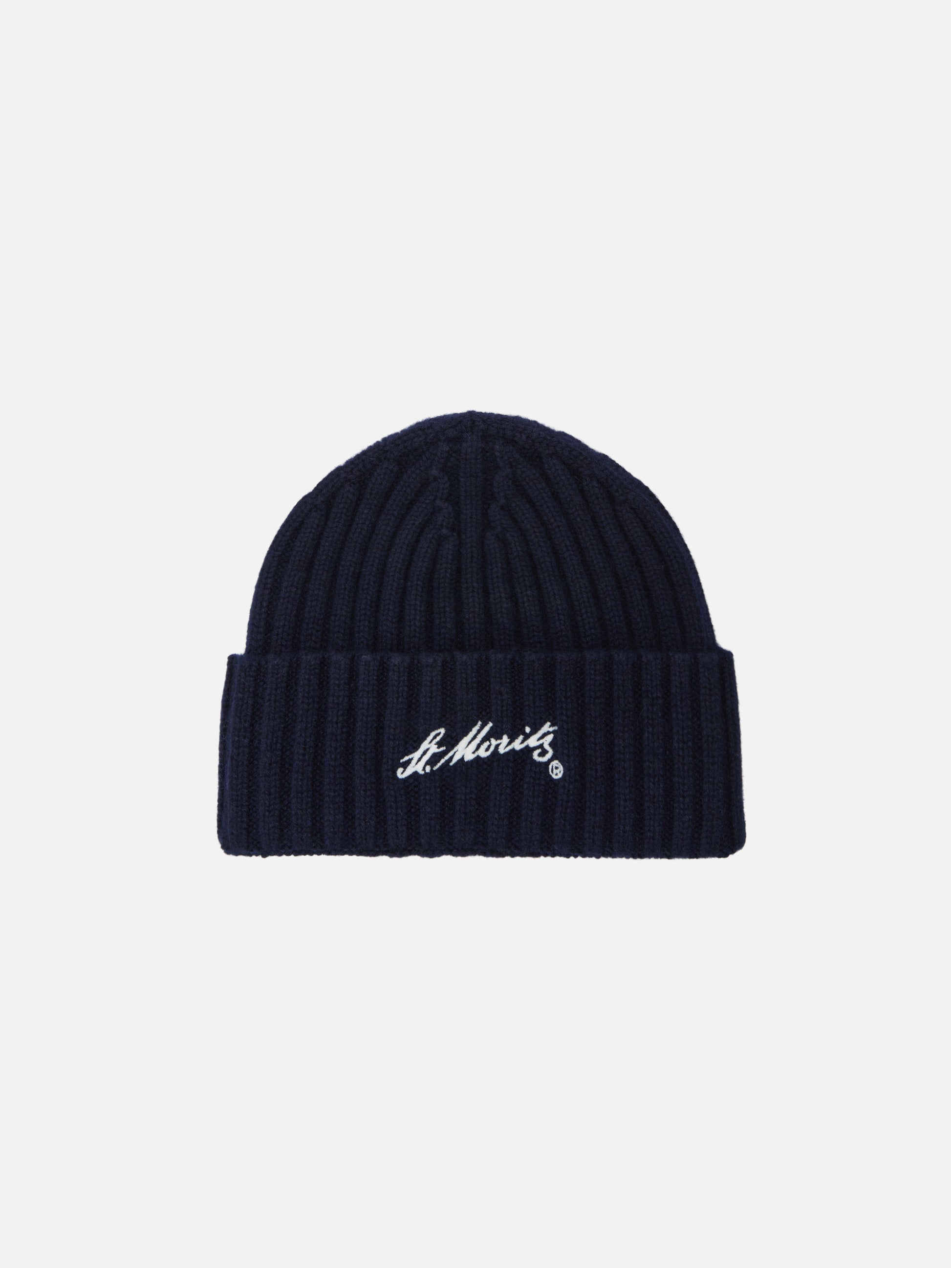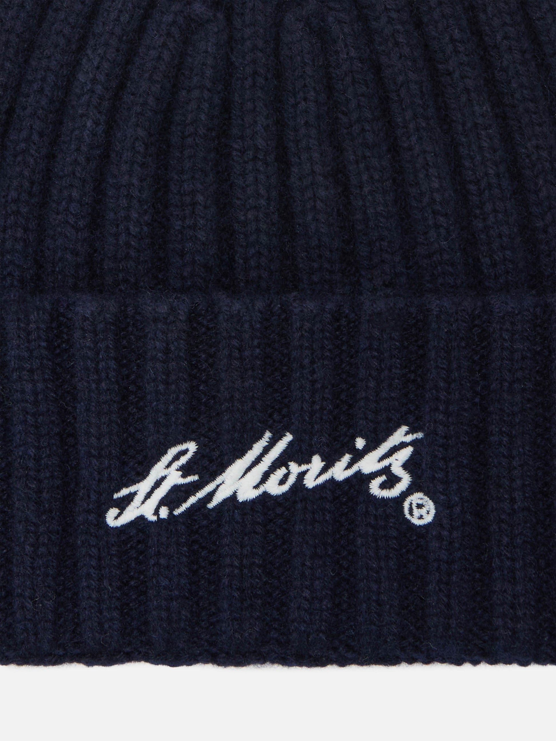 Wengen beanie in cashmere in blue with St. Moritz embroidery
