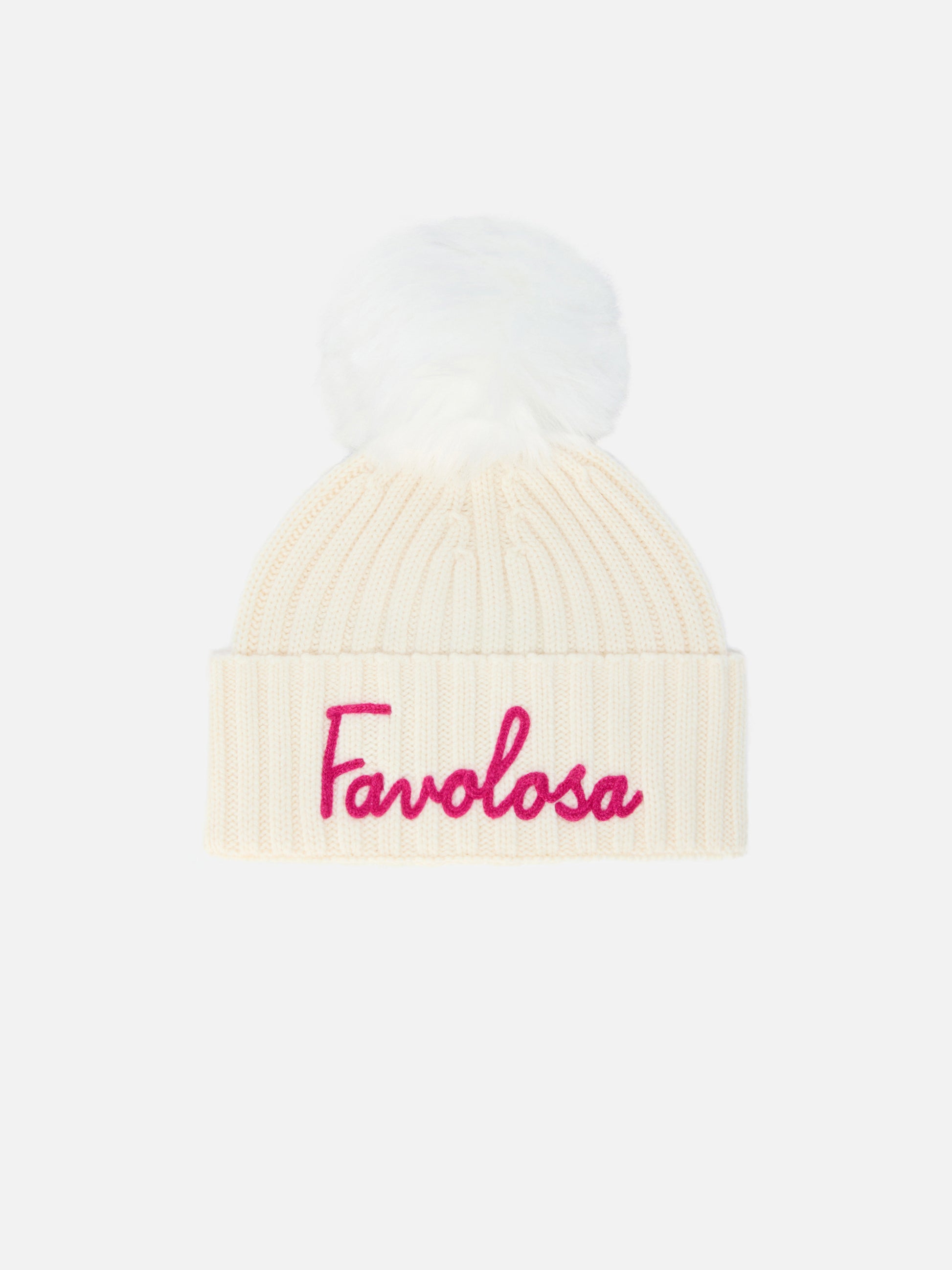 Wengen Jr F beanie in cashmere blend in white with Favolosa embroidery