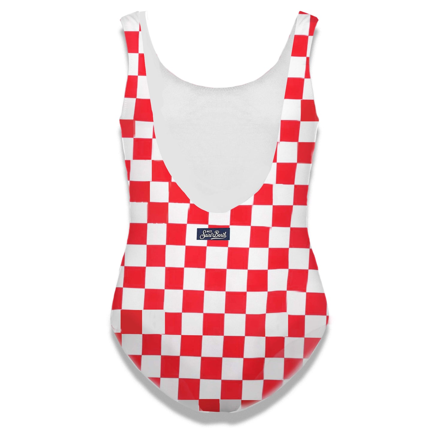 Girl's one piece swimsuit, red and white check all over print, St. Barth white front graphic, round neck, stretch fit.