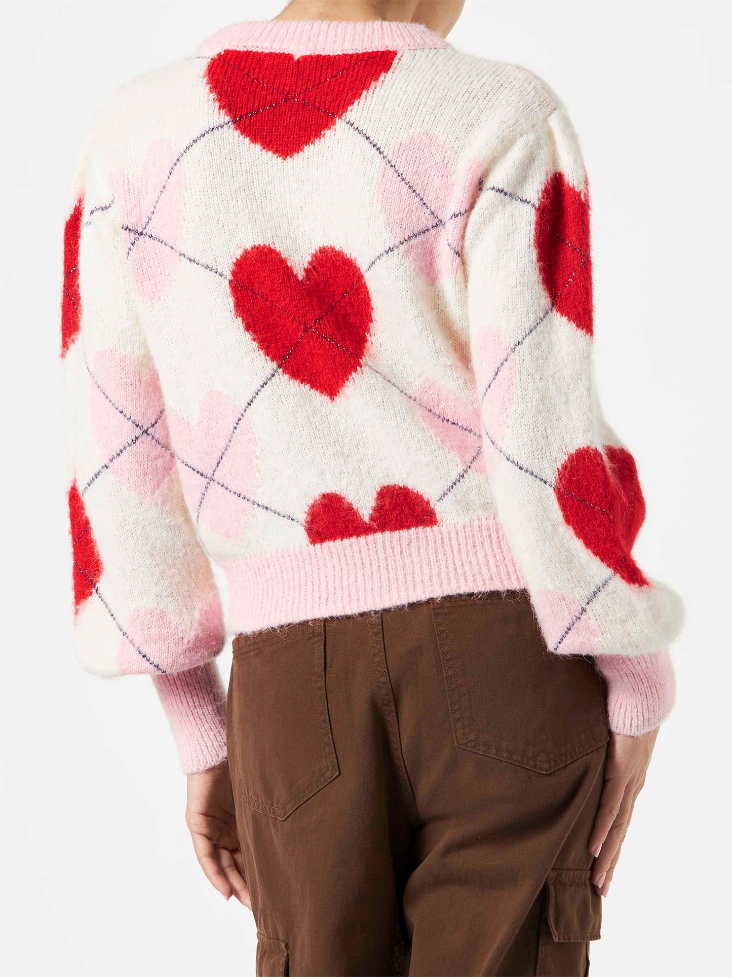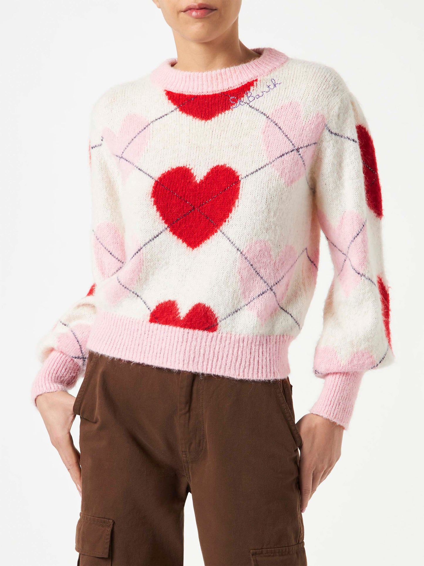 Woman brushed striped sweater with heart pattern