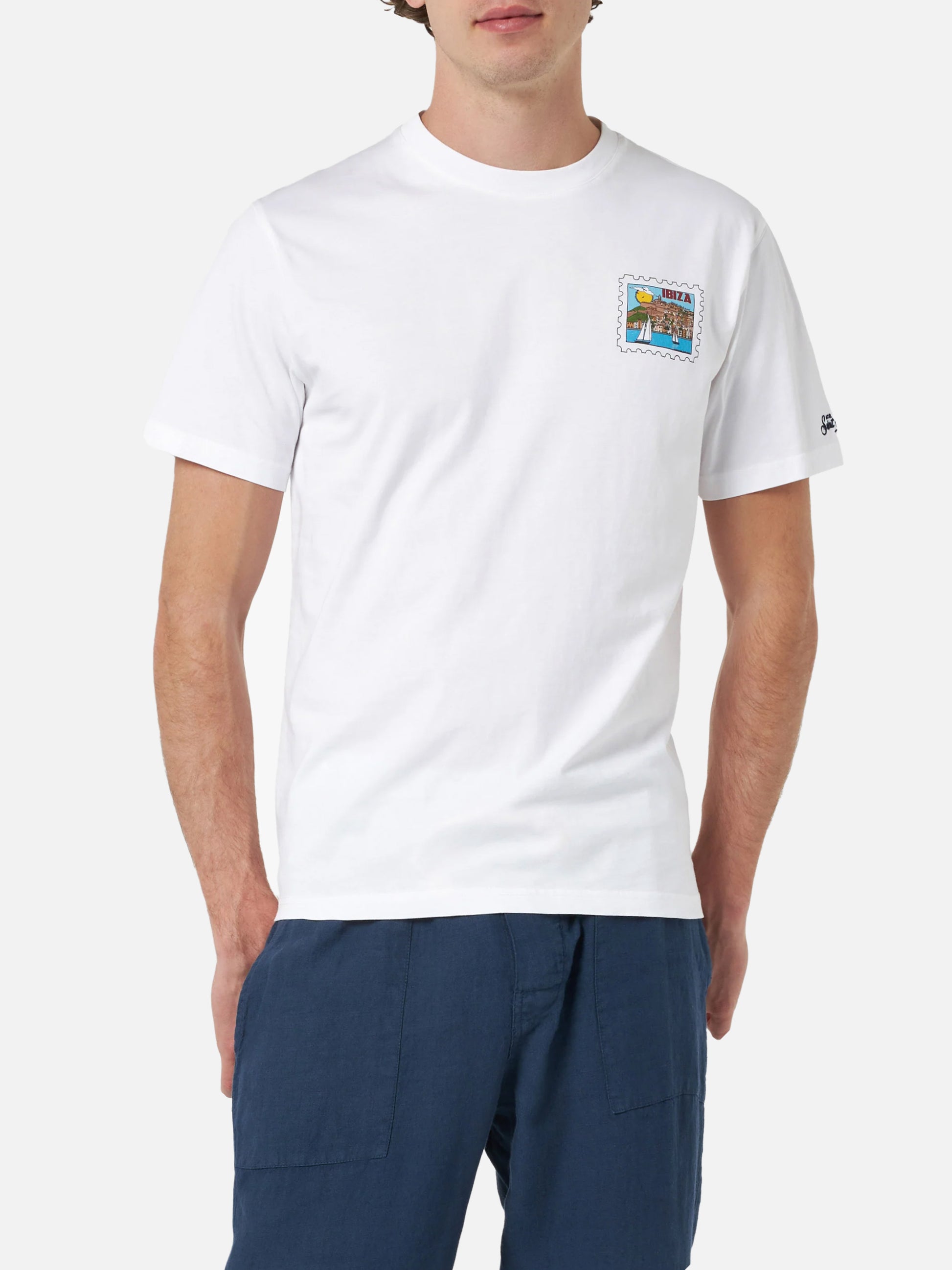 T-shirt da uomo in cotone con stampa cartolina Ibiza davanti e dietro | EDIZIONE SPECIALE ALESSANDRO ENRIQUEZ