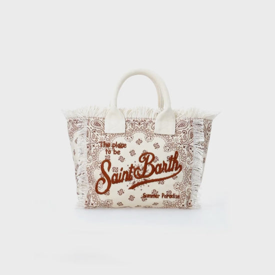 Ti presentiamo la nostra borsa da spiaggia in tela di cotone Colette: un accessorio estivo essenziale che va oltre le coste, perfetto per abbracciare le vibrazioni baciate dal sole ovunque tu vada. Realizzata in tela di cotone resistente e leggera, questa borsa è pensata per le gite in spiaggia, le scappatelle estive e i momenti piacevoli. Il suo interno spazioso offre ampio spazio per gli oggetti essenziali per la spiaggia, asciugamani e altro ancora. Con un design vivace ed elegante, questa borsa passa facilmente dalle coste sabbiose alle strade della città. Le robuste maniglie garantiscono un facile trasporto, mentre lo stile versatile lo rende un compagno perfetto per il tempo libero, le gite informali o le avventure in vacanza. Abbraccia il fascino rilassato dell'estate con la nostra borsa Colette: il tuo accessorio preferito per tutte le cose soleggiate e spensierate Borsa a mano Colette in tela di cotone con frange Stampa su tutta la superficie della bandana bianco sporco Logo ricamato con firma Saint Barth Patta interna con cerniera Tasca interna con cerniera Dimensioni: 30 x 22 x 15 cm Composizione: 100% cotone
