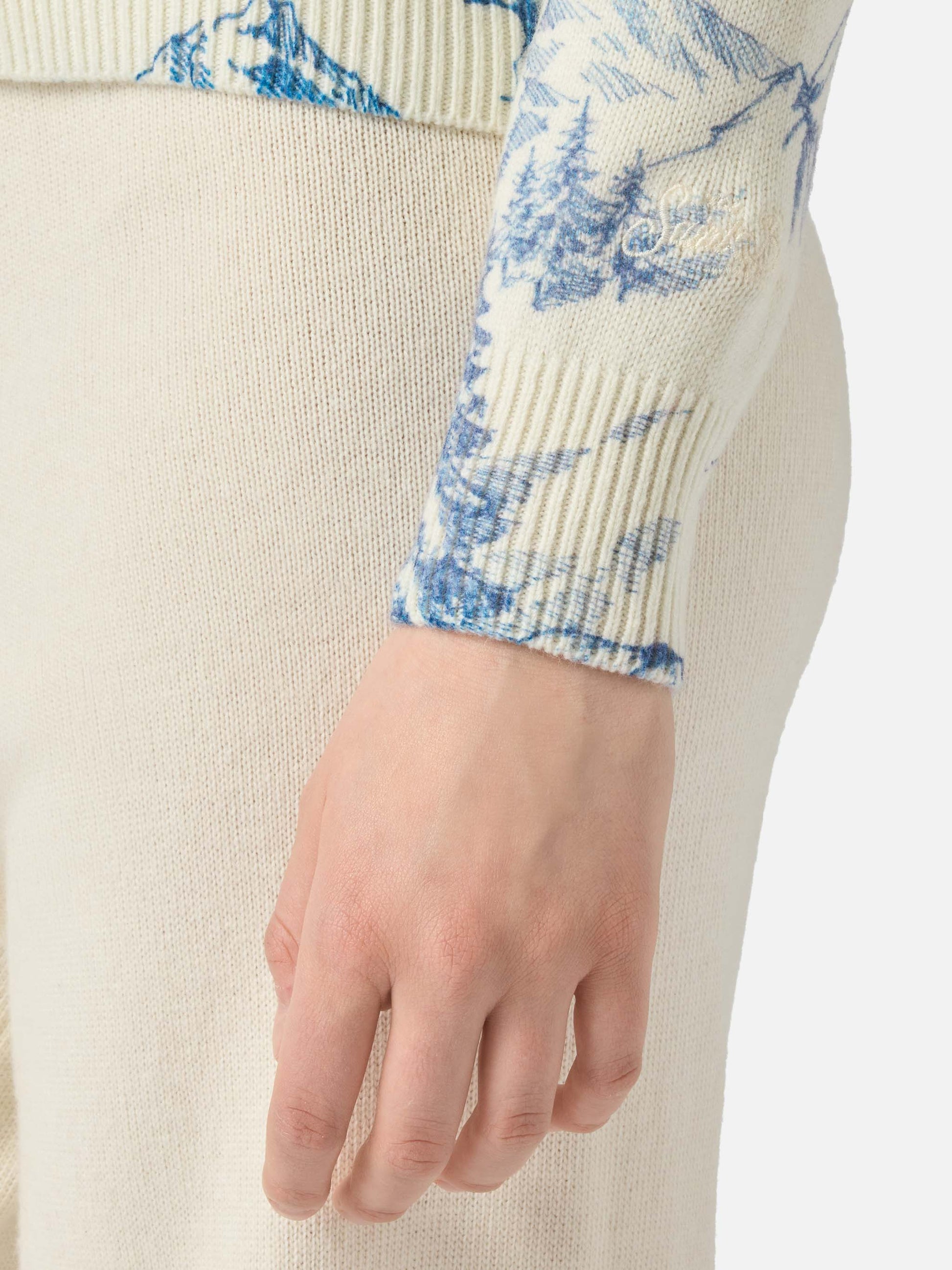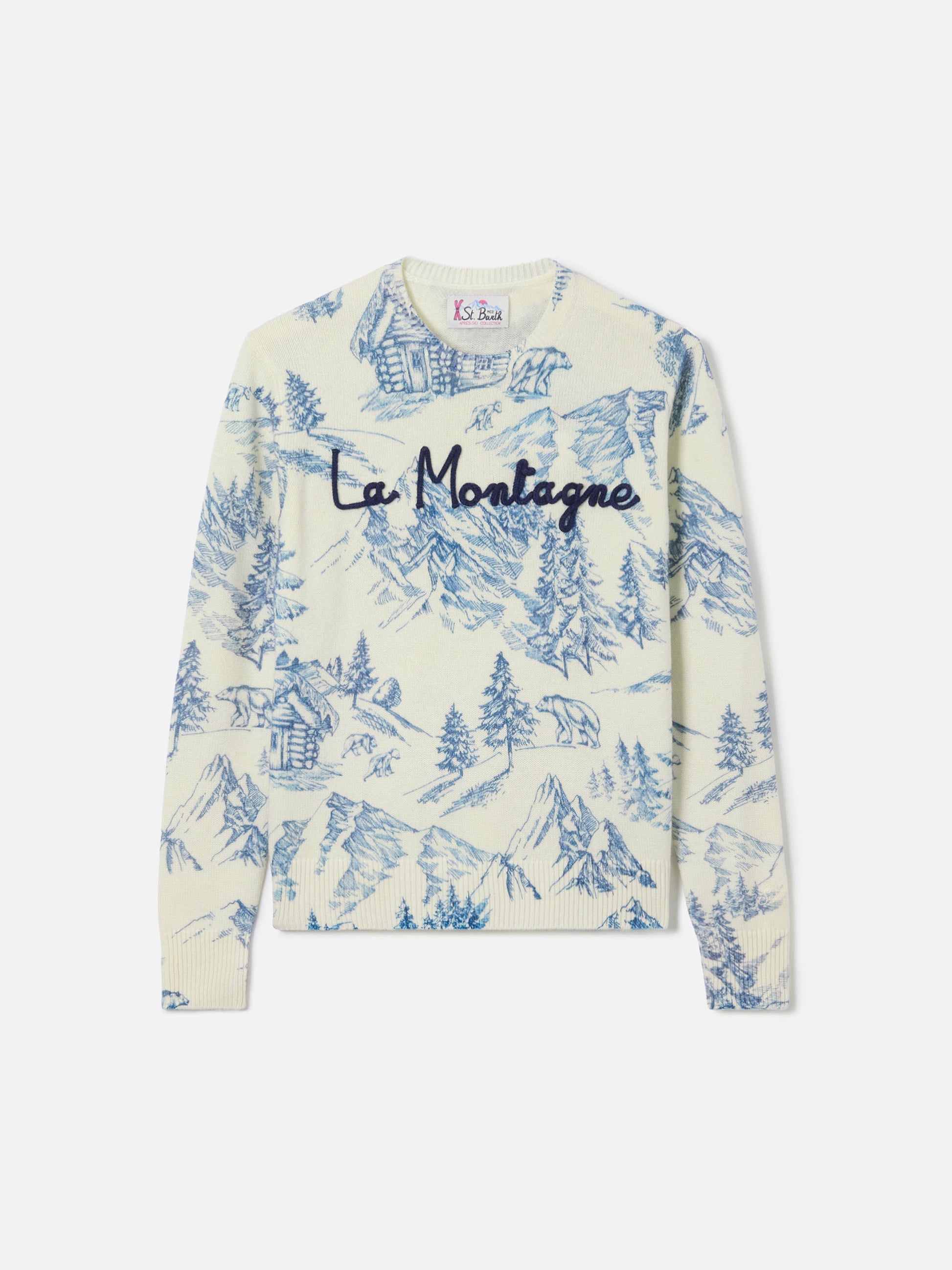 Maglione bianco da donna New Queen con stampa toile de jouy e ricamo La Montagne