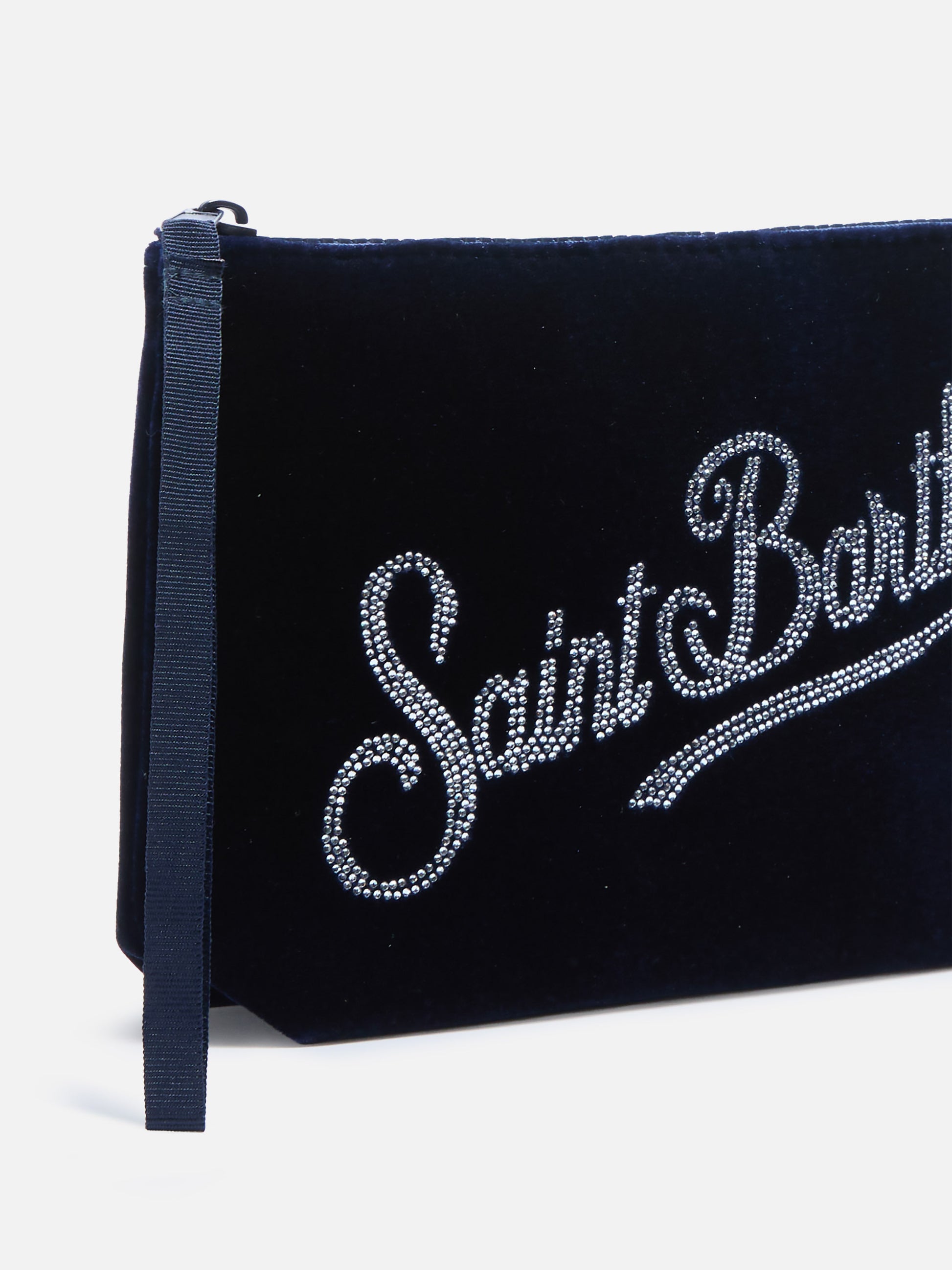 Aline blue velvet-effect scuba pouch with rhinestone logo