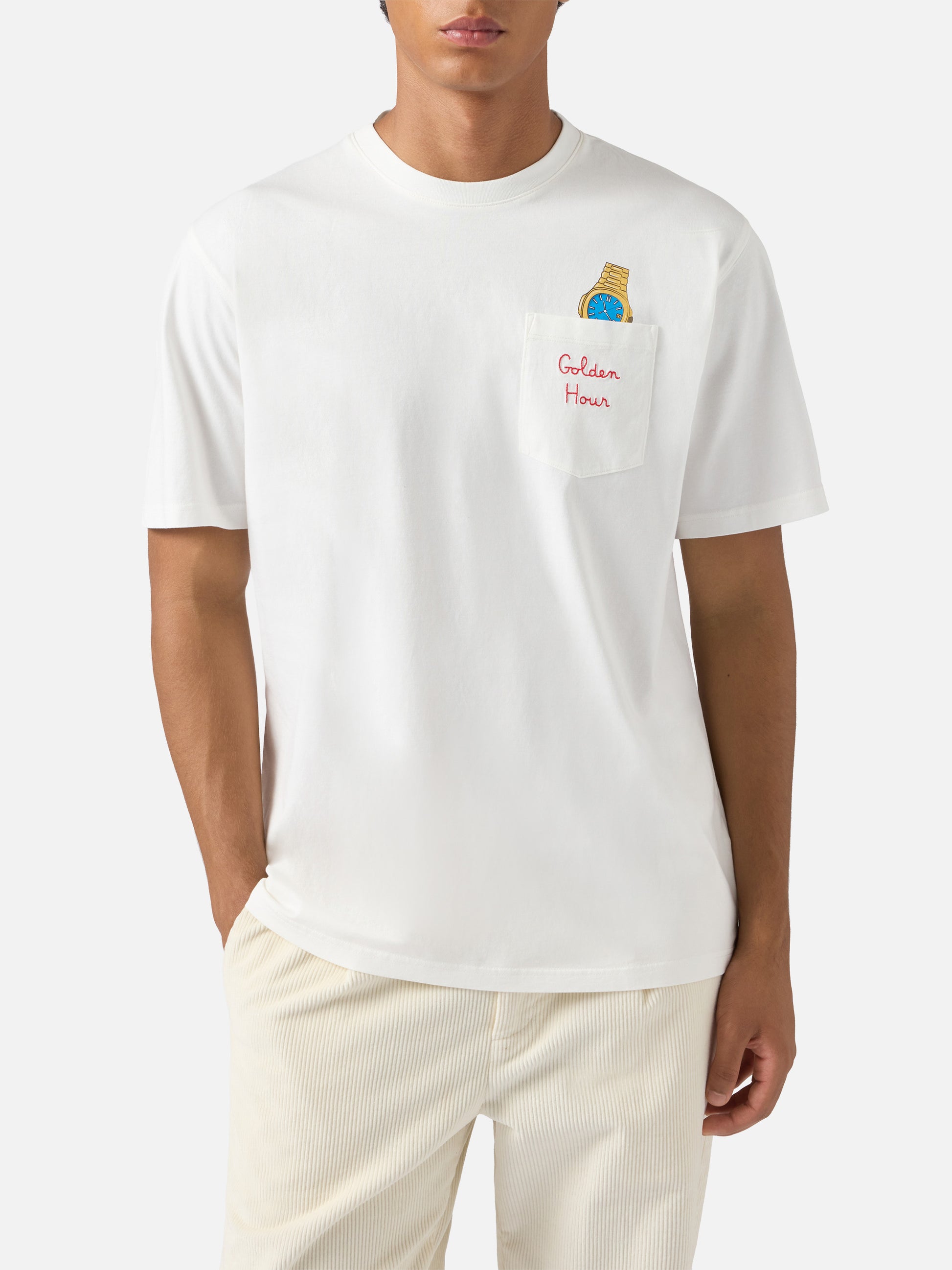 Connor cotton T-shirt in white with Golden hour pocket embroidery