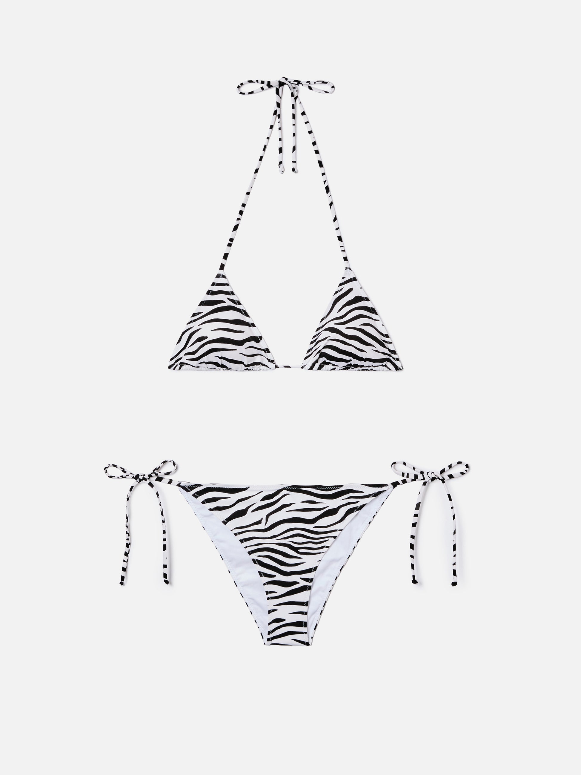 The Leah Teen bikini for teen girls is crafted from stretch fabric featuring a black and white zebra print. The bold animal motif gives the style a strong and contemporary beach look. It features a triangle top with adjustable tie straps and removable cups, paired with side tie bottoms. The garment is fully lined and offers a slim fit.