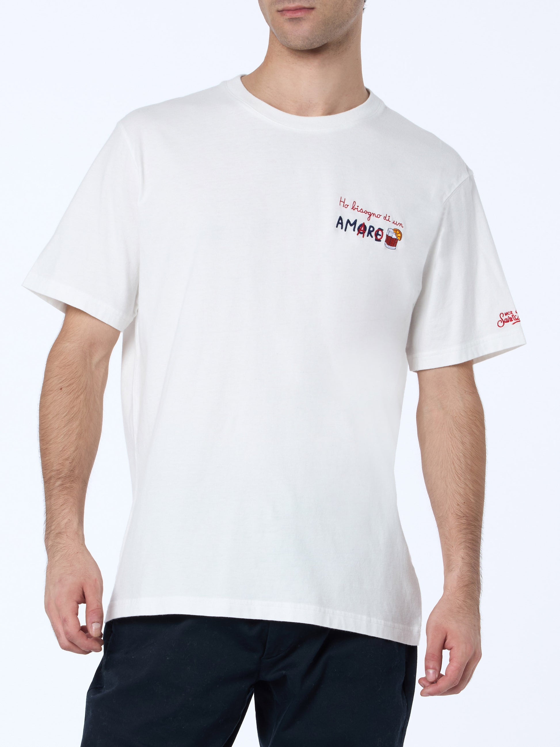 Herren-T-Shirt Arnott aus schwerer Baumwolle mit Ho bisogno di un amaro-Stickerei