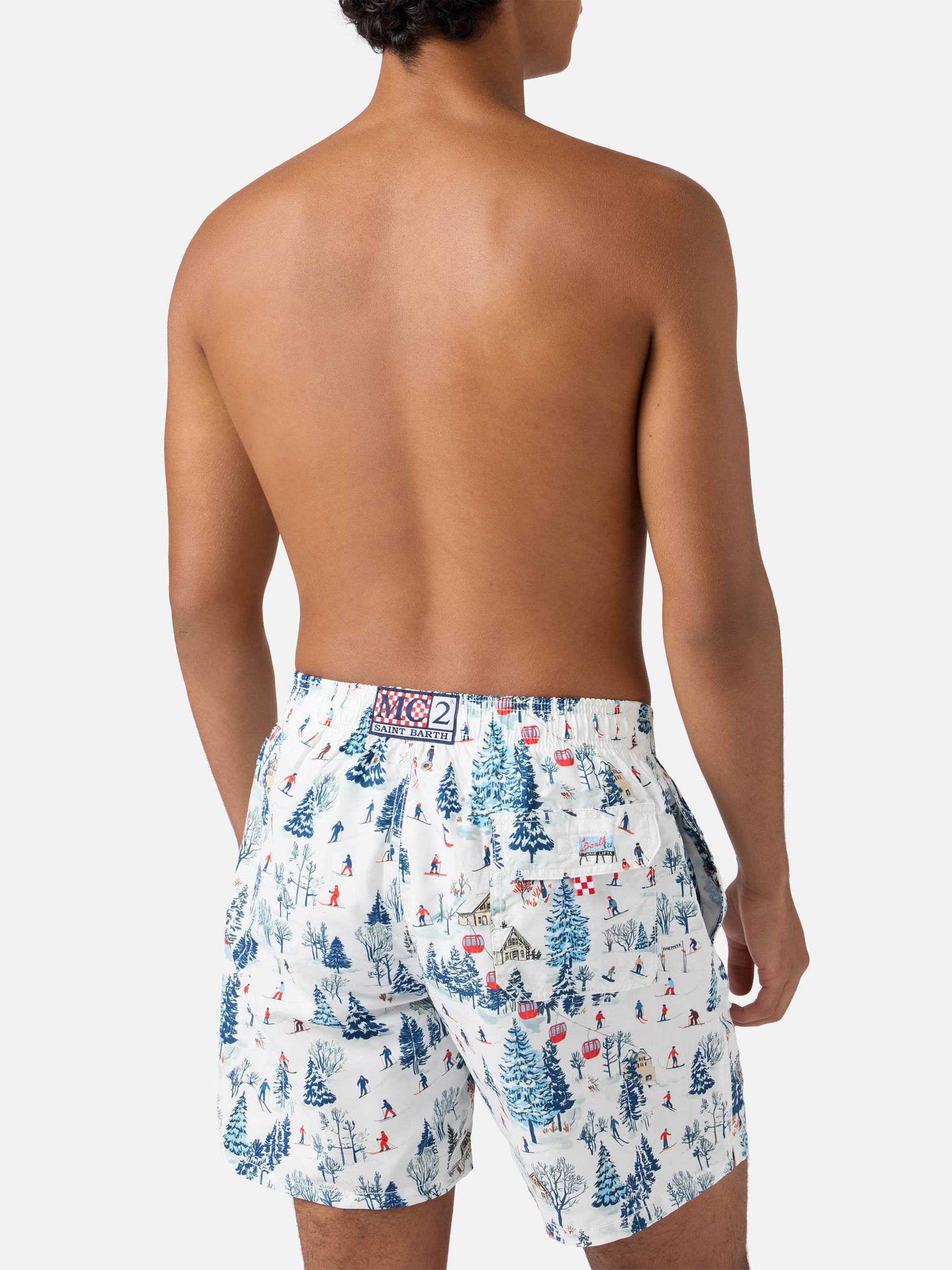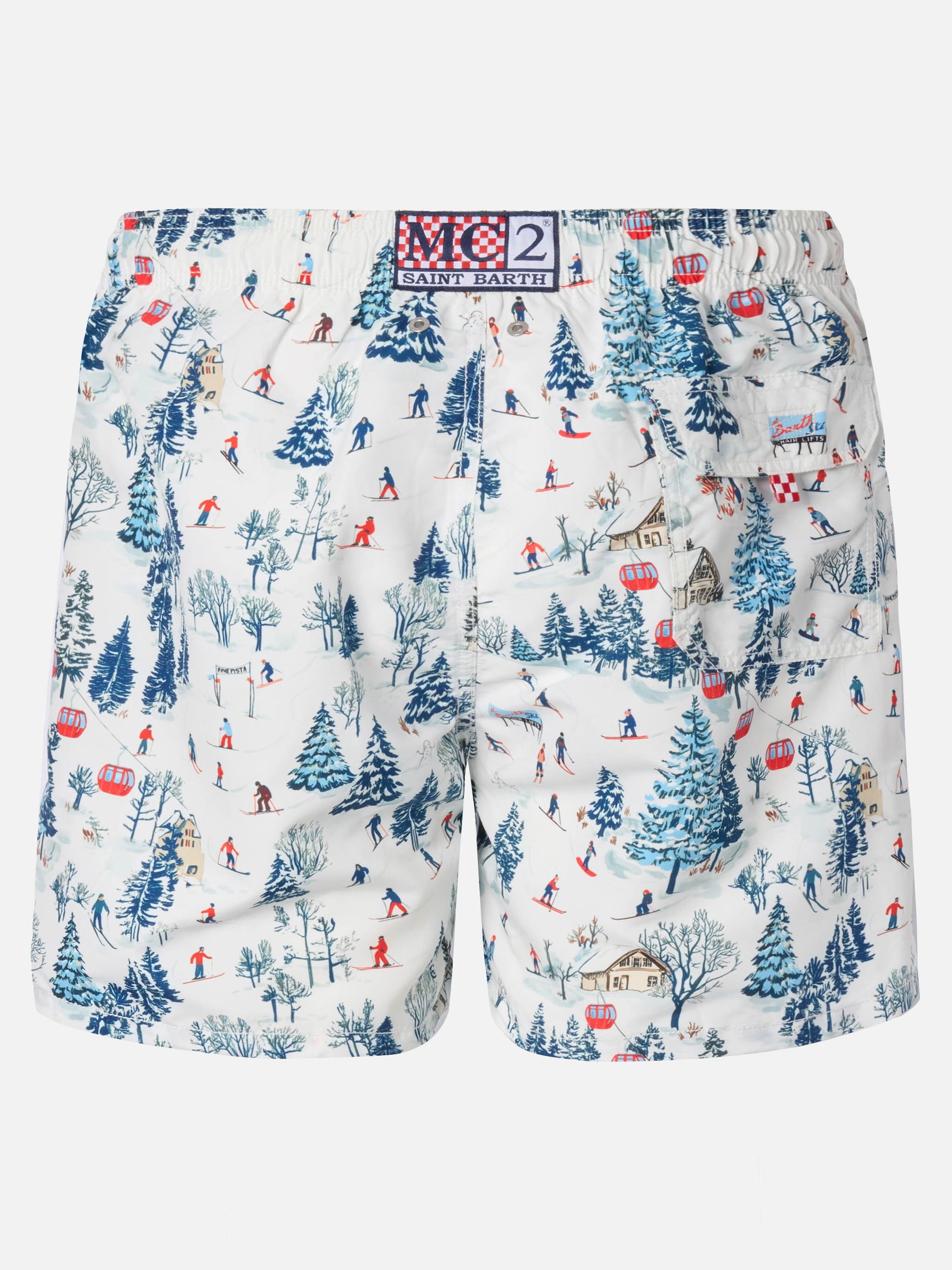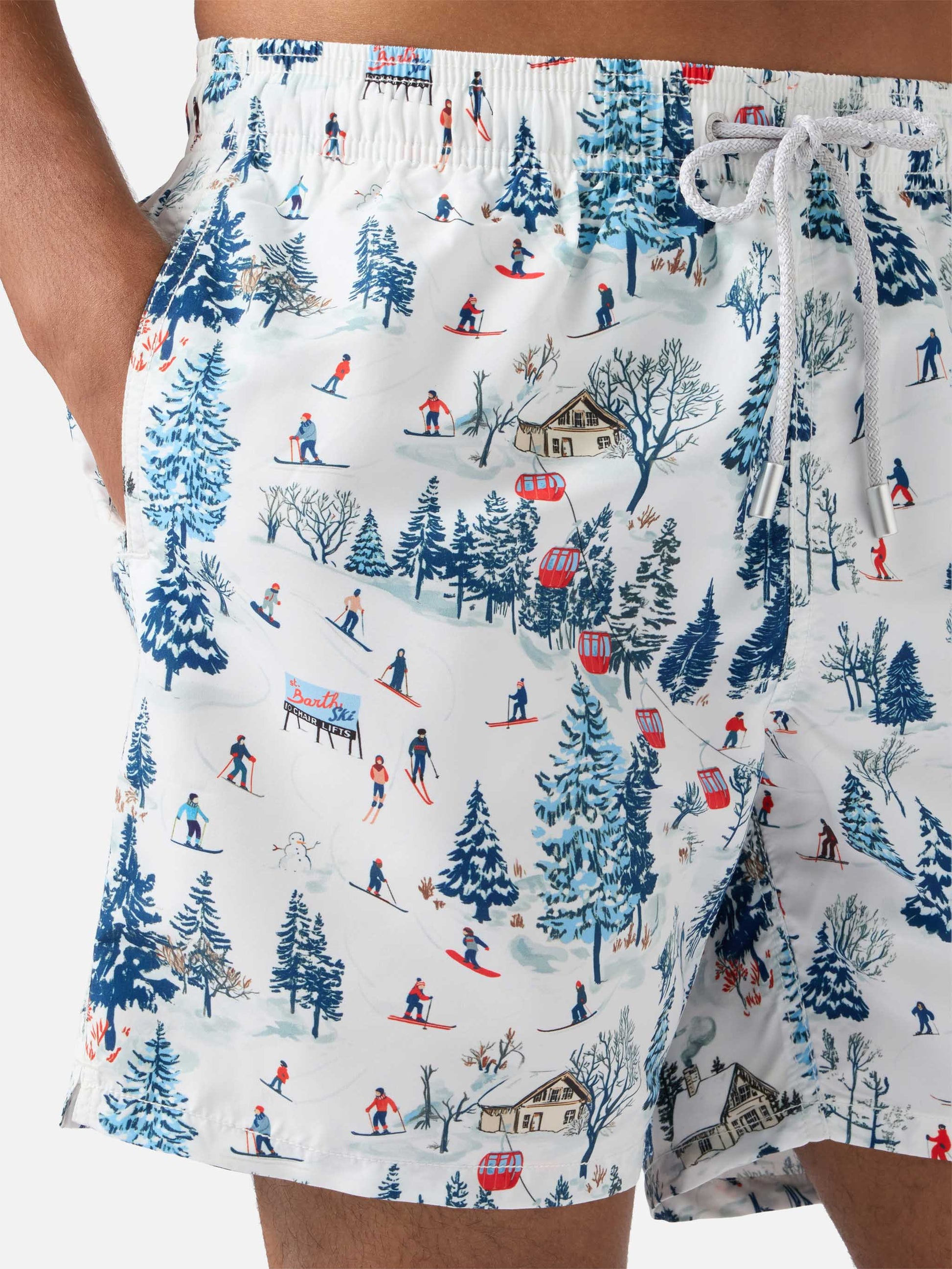 Gustavia is a timeless MC2 Saint Barth beachwear staple, featuring a classic fit, elasticized waist with drawstring, inner mesh lining for comfort, and back eyelets to prevent ballooning. Made from peach-touch fabric for a luxurious feel, it comes in a wide range of colors and patterns. Since past seasons, it's crafted from recycled polyester, reflecting our commitment to sustainability. ski landscape all-over print White backcloth Elasticated waistband for comfort Adjustable drawcord with branded terminals Inner net lining Side pockets with French seams Back patch pocket with velcro closure Branded eyelets designed to drain water and avoid the ballooning effect MC2 Saint Barth exclusive label on the back Classic fit Composition: 100% recycled polyester Size L has a half waistband width of 52 cm (stretched) and varies by 2 cm for each size; side length including waistband 41.5 cm Please note that all measurements provided are approximate and subject to a tolerance of 1-2 cm due to manual measurement. This tolerance range is normal and should be expected. Model is 185 cm and wears a size large Care Instructions: cold wash by running water and neutral soap. Hang to dry. Do not leave to soak and do not dry in contact with other clothing. Do not leave the garment wet in contact with other clothing.