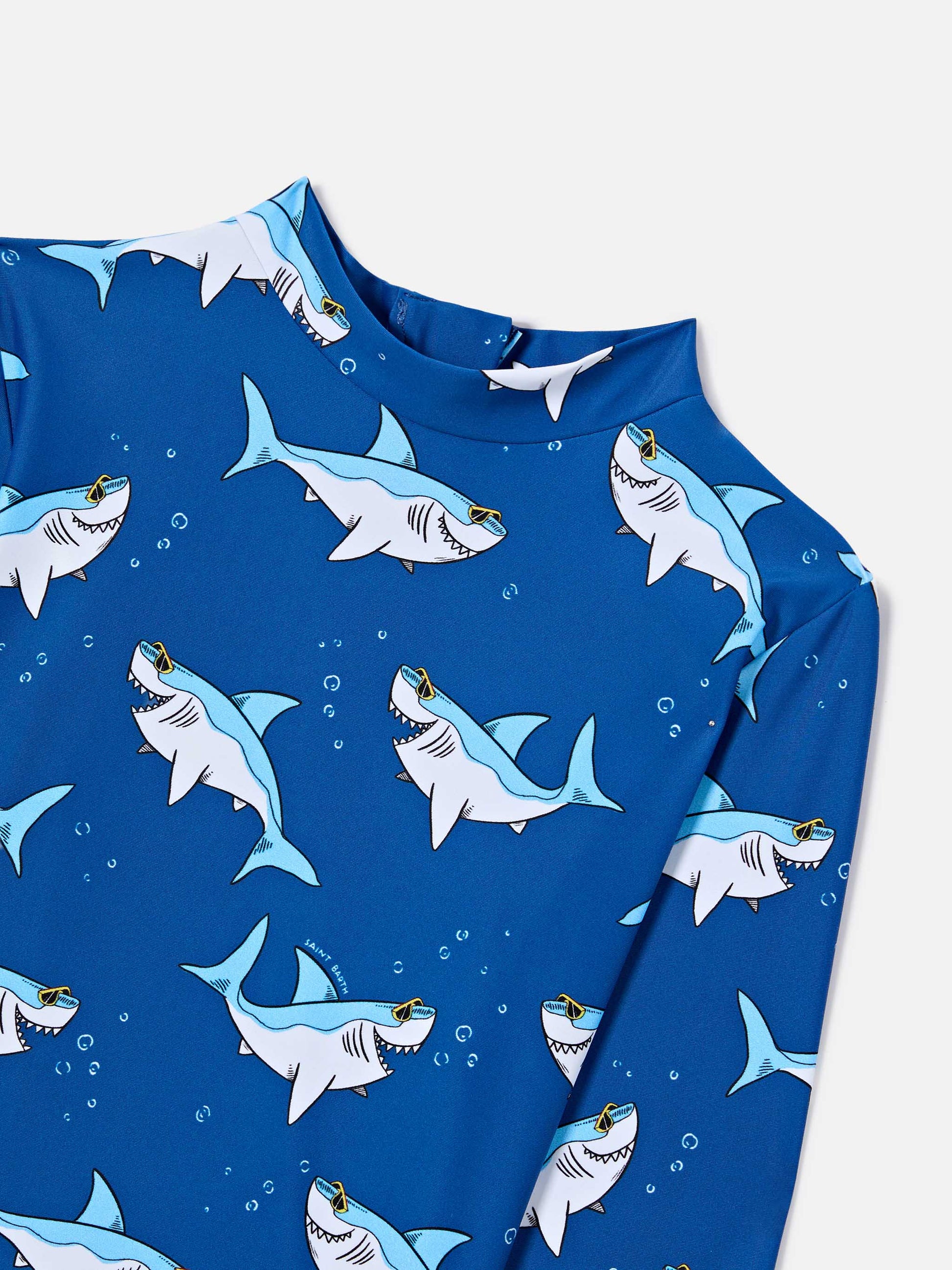 The Moorish t-shirt for boys is made of anti-UV stretch technical fabric, designed to offer comfort and protection during seaside activities. The design with all-over shark print defines the garment with a dynamic aesthetic. The model features long sleeves, a slightly high collar and a zip closure on the back. The fitted line ensures a comfortable fit.