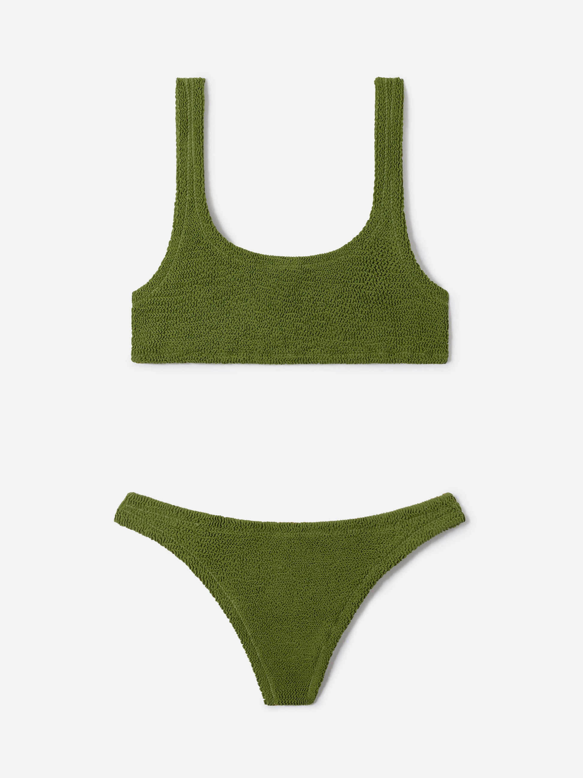 The Naima Naomi bikini is crafted from stretch crinkle fabric characterized by a textured surface that adds depth to the color and a distinctive dimensional effect. The Naima bralette top features wide straps designed to provide stability and comfort while ensuring medium support and coverage. The solid military green design maintains a clean and contemporary aesthetic. The Naomi Brazilian bottom features an unlined structure with reduced coverage designed to enhance the silhouette with a balanced close fit.