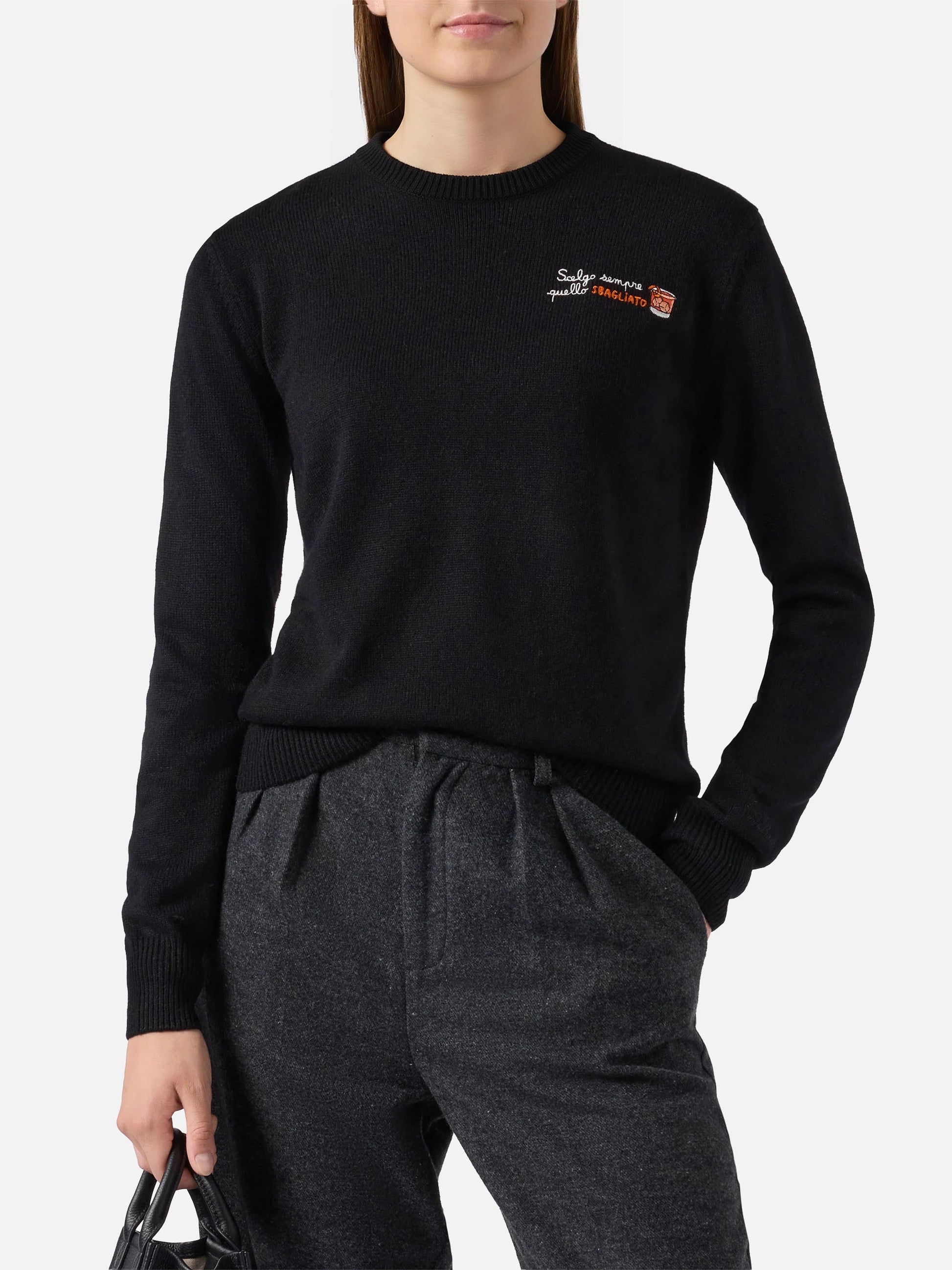 New Queen cashmere-blend sweater in black with Scelgo sempre quello sbagliato embroidery