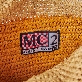 Beuteltasche aus Raffiabast mit mehrfarbigen Streifen und Stickerei