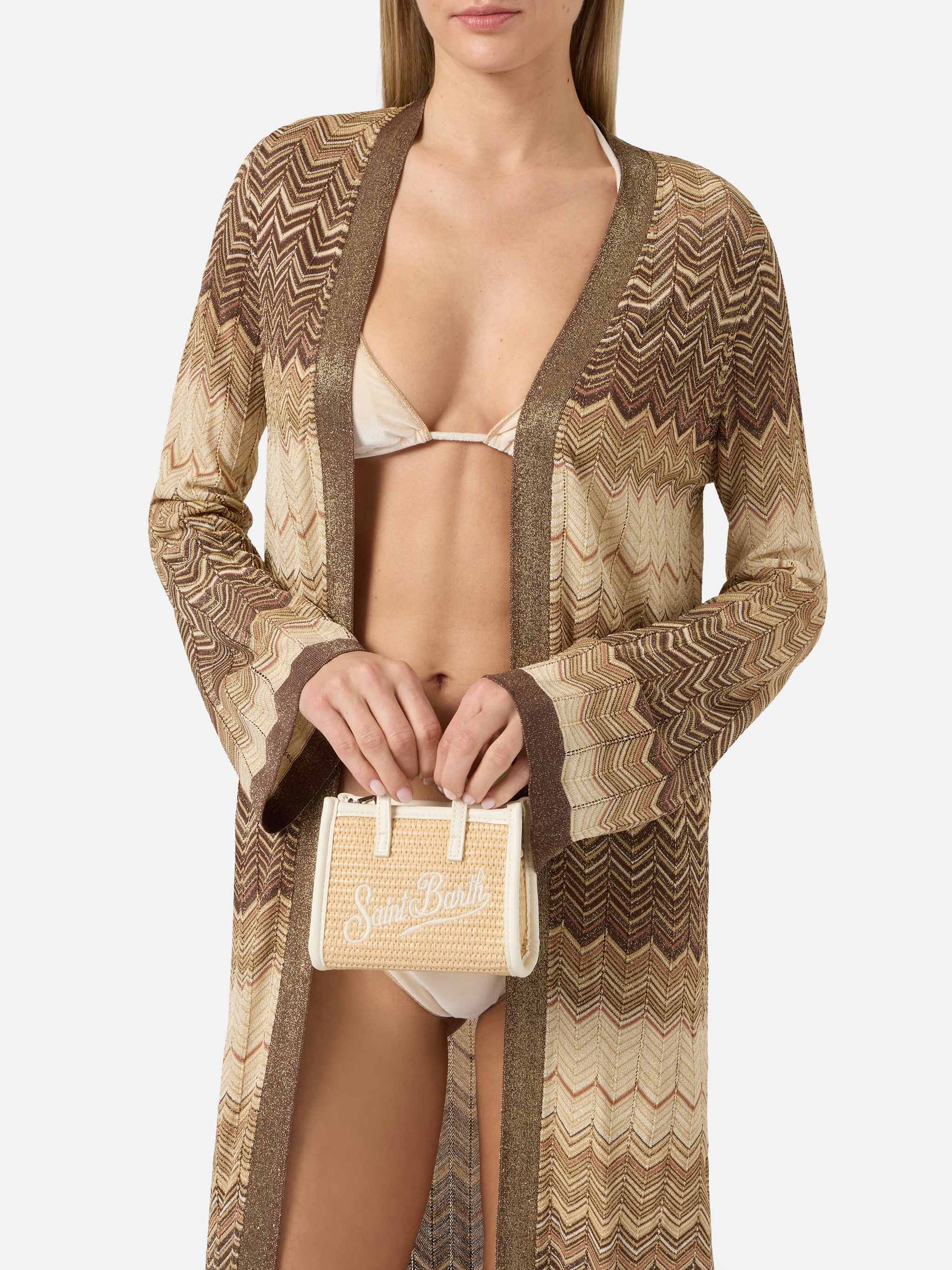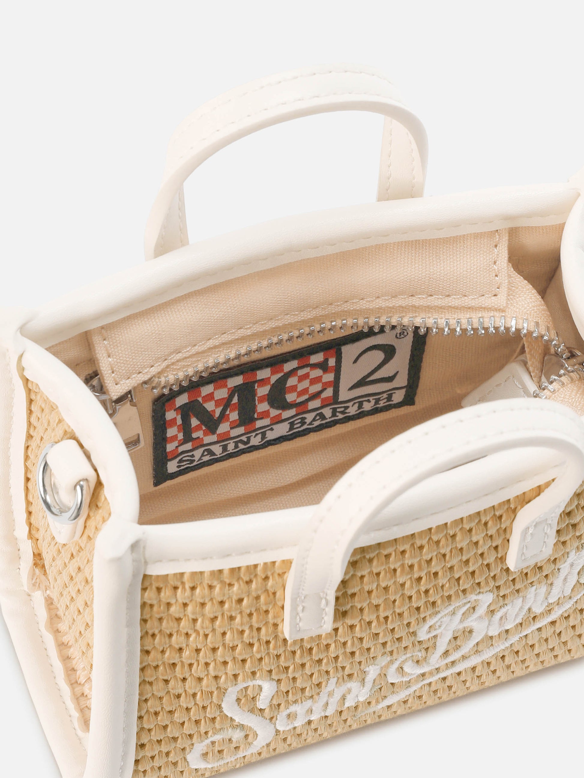 Vivian micro straw effect bag with white embroidered logo