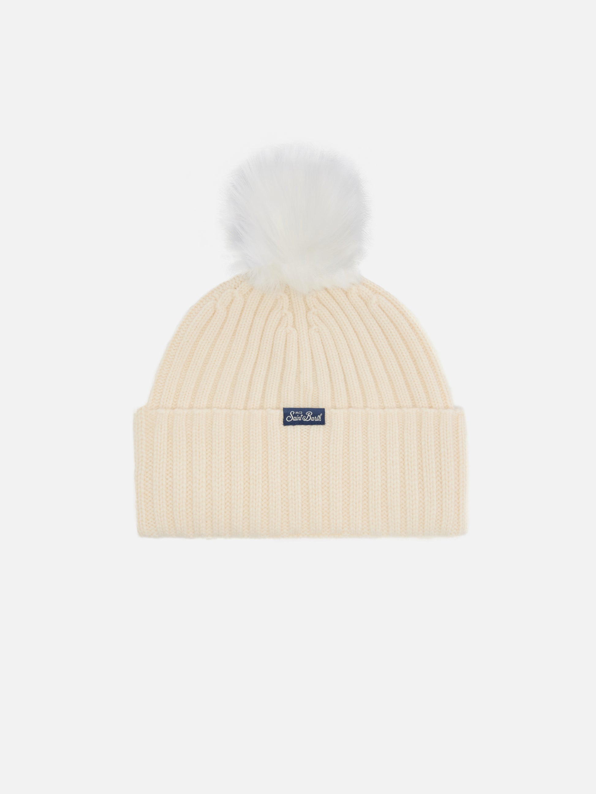 Wengen beanie in cashmere blend in white with lurex Cortina embroidery and pom-pom