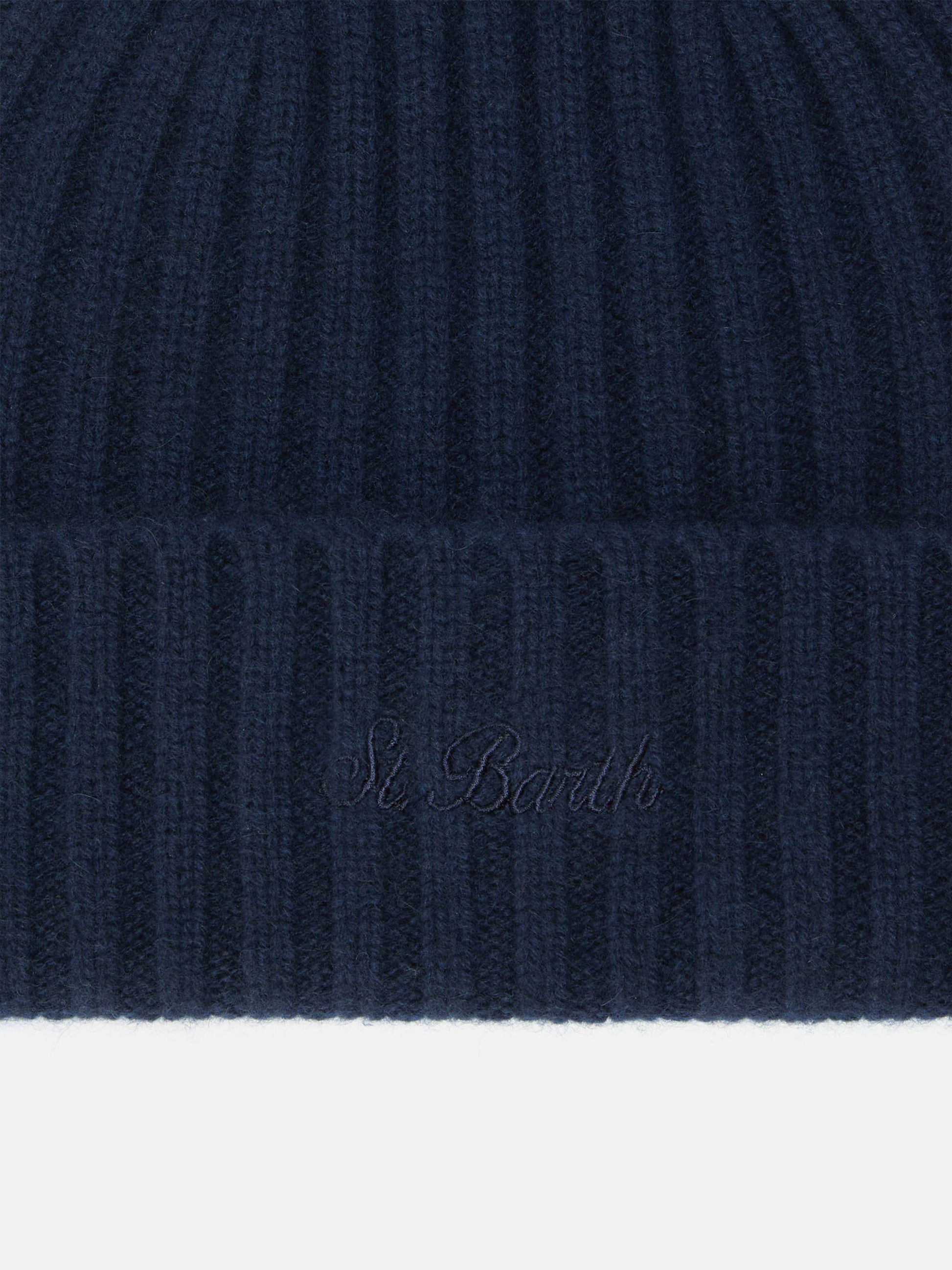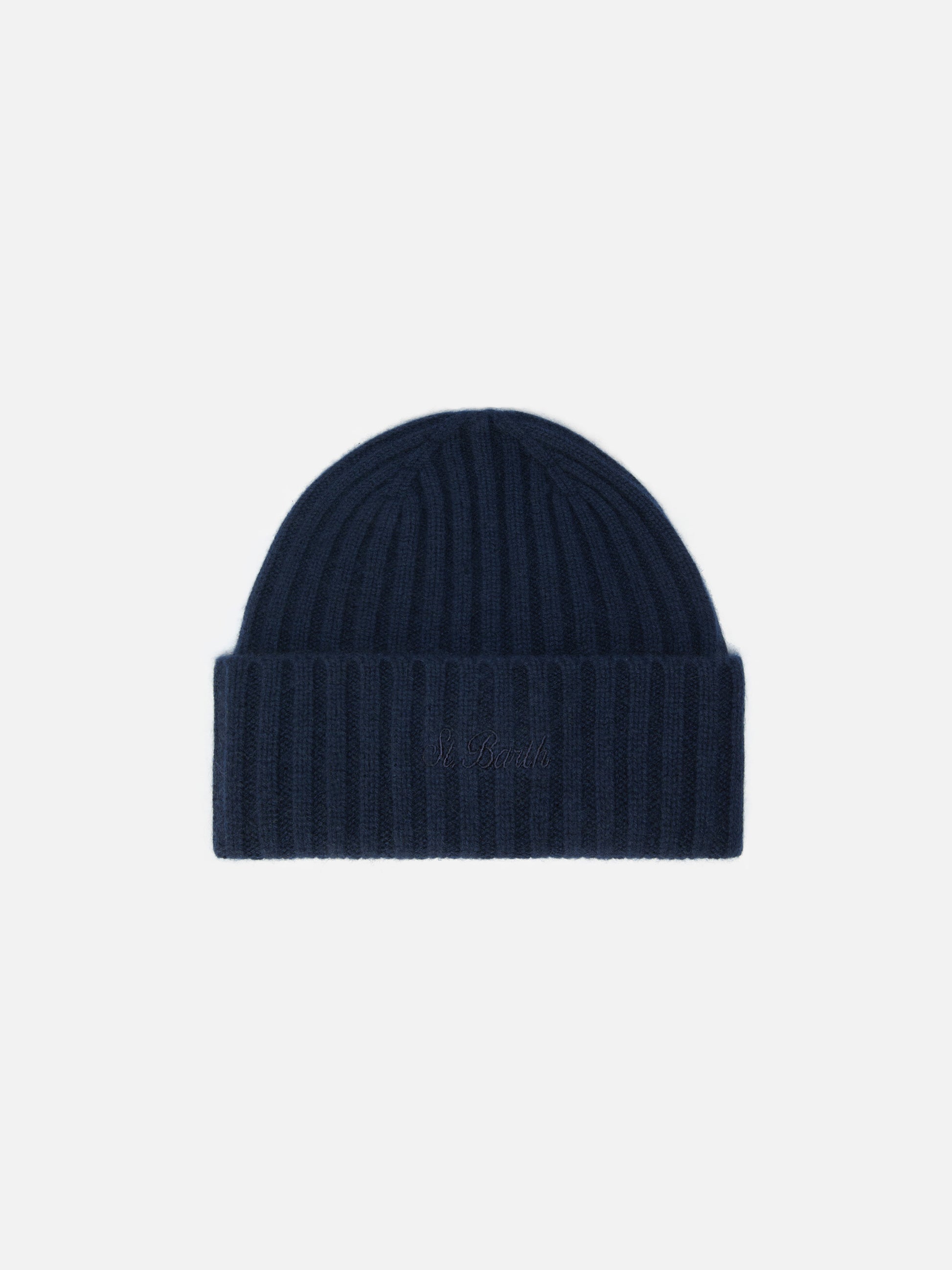 Wengen beanie in cashmere in navy blue with St. Barth embroidery on the turn-up