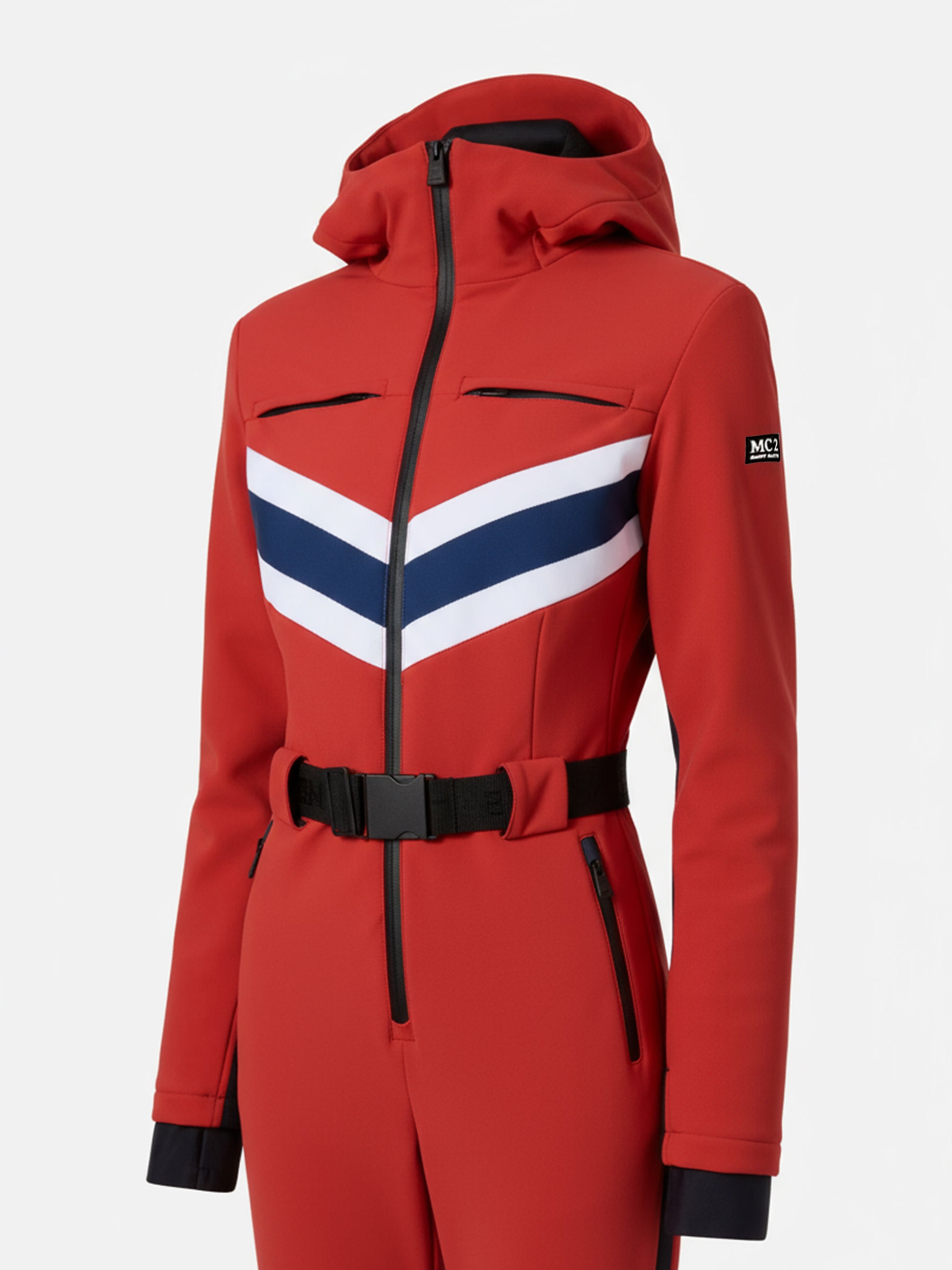 The woman Garmisch ski suit is a technical and elegant garment designed to deliver high performance on the slopes without compromising on style. Engineered to provide comfort, protection, and freedom of movement, it is ideal for skiers who want to tackle extreme conditions with confidence and class. Made from high-quality waterproof and breathable materials, it offers complete protection against cold, wind, and moisture, keeping the body warm and dry. It features an ergonomic and form-fitting design, tailored to follow the body's movements during sports activities. The seams are reinforced and strategically positioned to ensure maximum durability and resilience, even in the most challenging conditions. red ski suit with navy blue details MC2 logo on the sleeve Hood High collar with front zipper extending from the hip level to above the collar Two welt pockets at chest height Two zippered pockets Belt loops Saint Barth branded belt Regular fit Composition: 82% Polyester, 14% Elastane, 4% Polyurethane